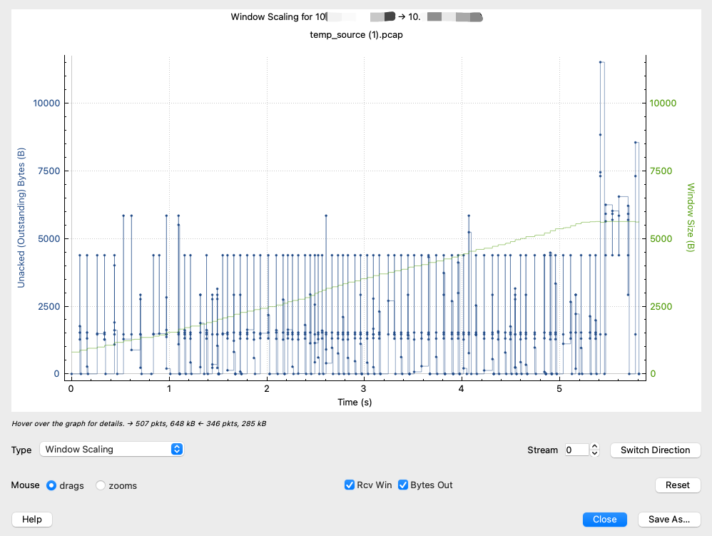 Window Scaling:查看TCP窗口和在途字节数的变化情况。