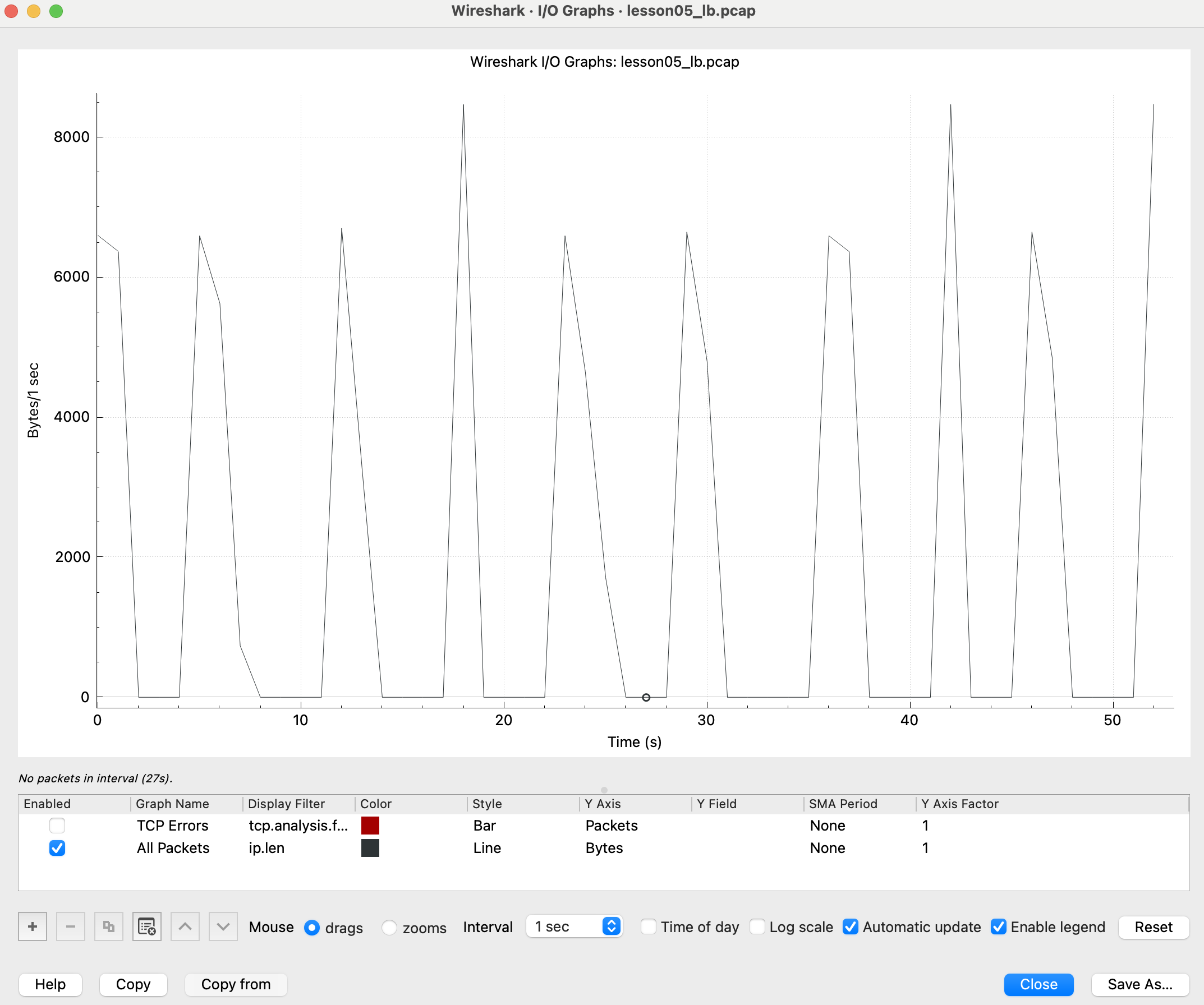 对于传输速度等分析场景来说,是否有重传往往并不重要,我们最关注的是整体的数据传输状况,那么这时候我们应该借助I/O Graphs提供的强大功能。这个子工具可以给我们展现一个或者多个TCP流在网络I/O视角下的流量图,很方便我们判断整体传输速度、特定时间点的速度快慢等。