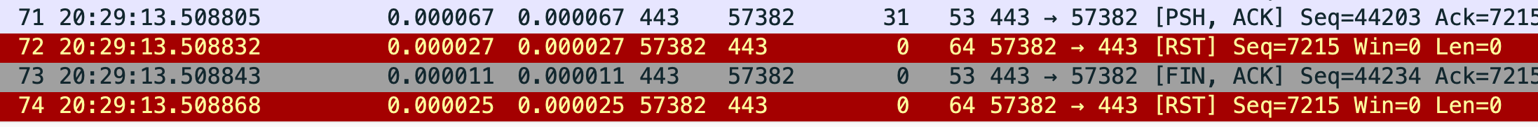 对于挥手阶段的异常状况比如RST报文,Wireshark会配以红底黄字。比如下面的报文72和74都是TCP RST报文,也就意味着这次挥手是存在问题的,需要加以重视。