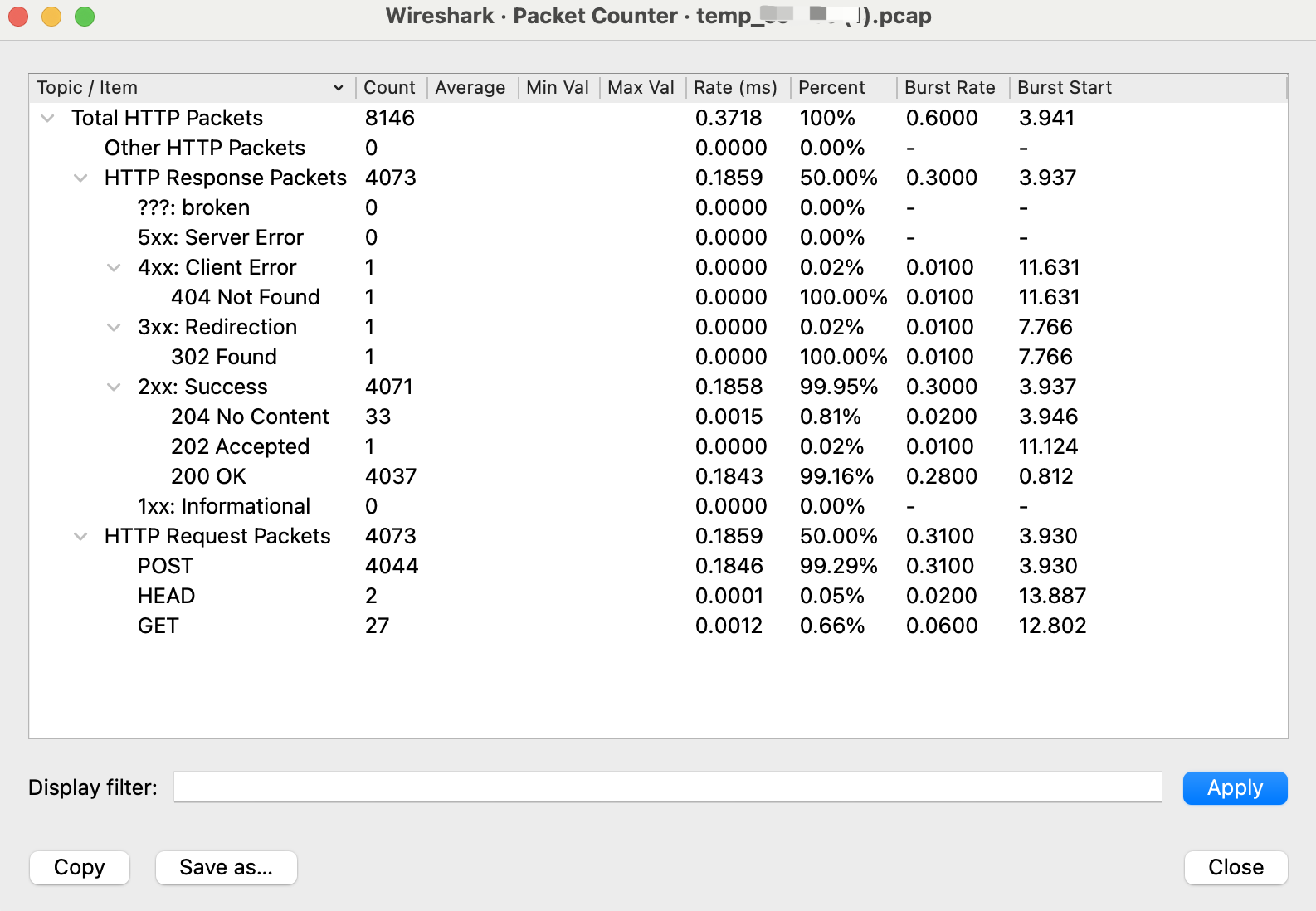 使用HTTP工具集,我们很容易获取到HTTP层面的信息,比如HTTP各种状态码(2xx、3xx、4xx、5xx等)的占比、HTTP各种方法的占比等等。这些信息再结合应用层日志就容易推进排查了。