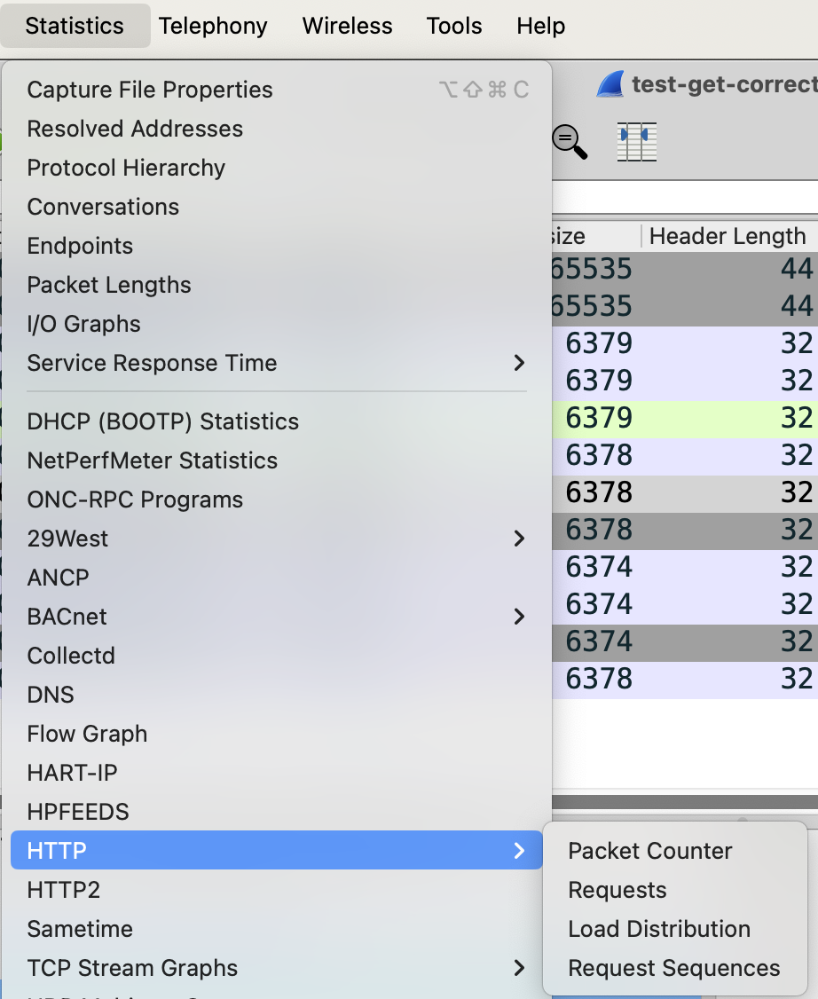随着微服务的发展,越来越多的基础组件和业务组件都用HTTP协议来实现联动,所以HTTP协议工具也很有用。在Wireshark的Statistics下拉菜单里,鼠标移动到HTTP,右侧自动弹出几个字工具,分别是Packet Counter、Requests、Load Distribution,还有Request Sequences。