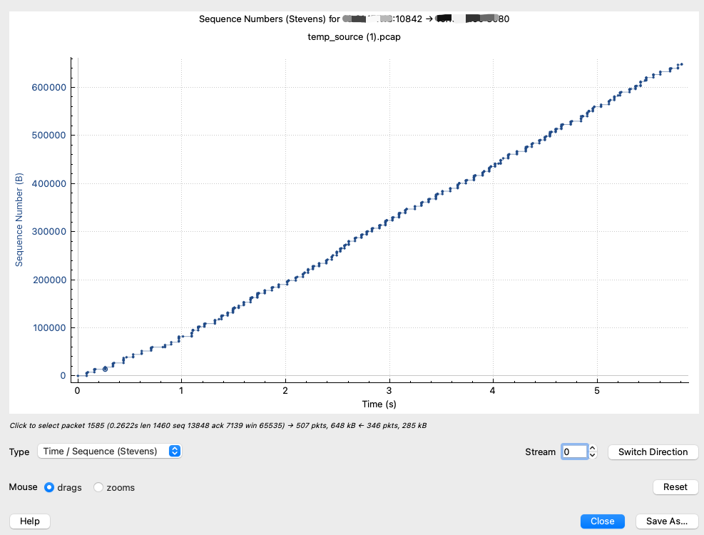 如果这个曲线里出现平台(就是随着时间增加,序列号不增加或增加很小的情况),那么一般意味着传输发生了停滞,需要重点关注这个时间段内的情况,这里往往是提升传输质量的重要突破口。