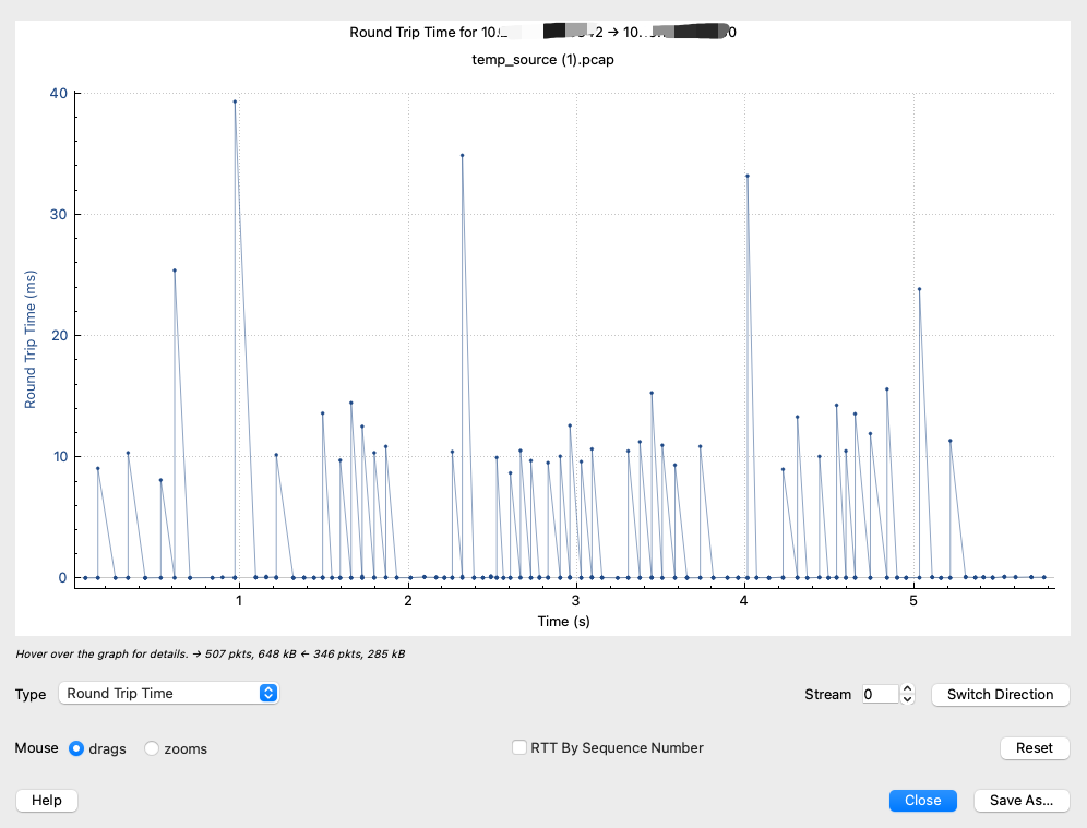 上图的例子中,Round Trip Time在0和40ms之间剧烈波动。而在我们印象中,Round Trip Time不是应该很稳定吗?其实,这里的往返时间特指TCP报文从发出到被确认的时间差。而一般意义上的往返时间,是指物理条件造成的网络时延,这种确实不太会波动。