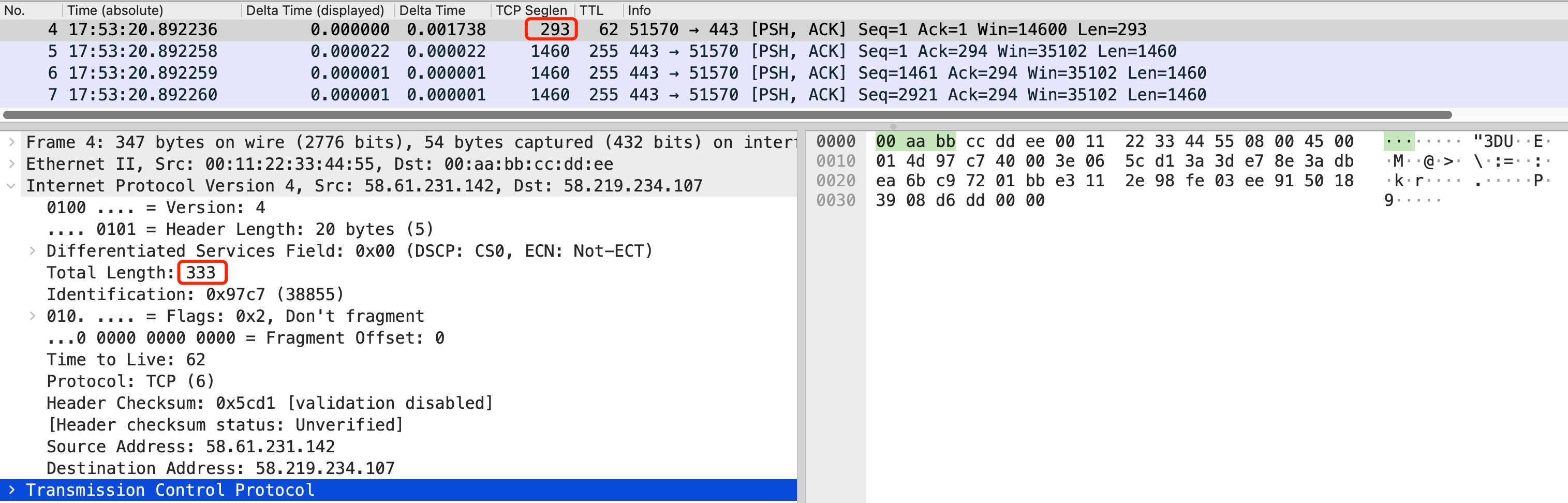 我们来看一个例子。下图中,4号报文的TCP载荷为293字节。加上IP头部20字节和TCP头部20字节,形成的总的IP报文的长度为293 + 20 + 20 = 333字节。截图中,IP头部的Total Length字段值就是333字节无误。