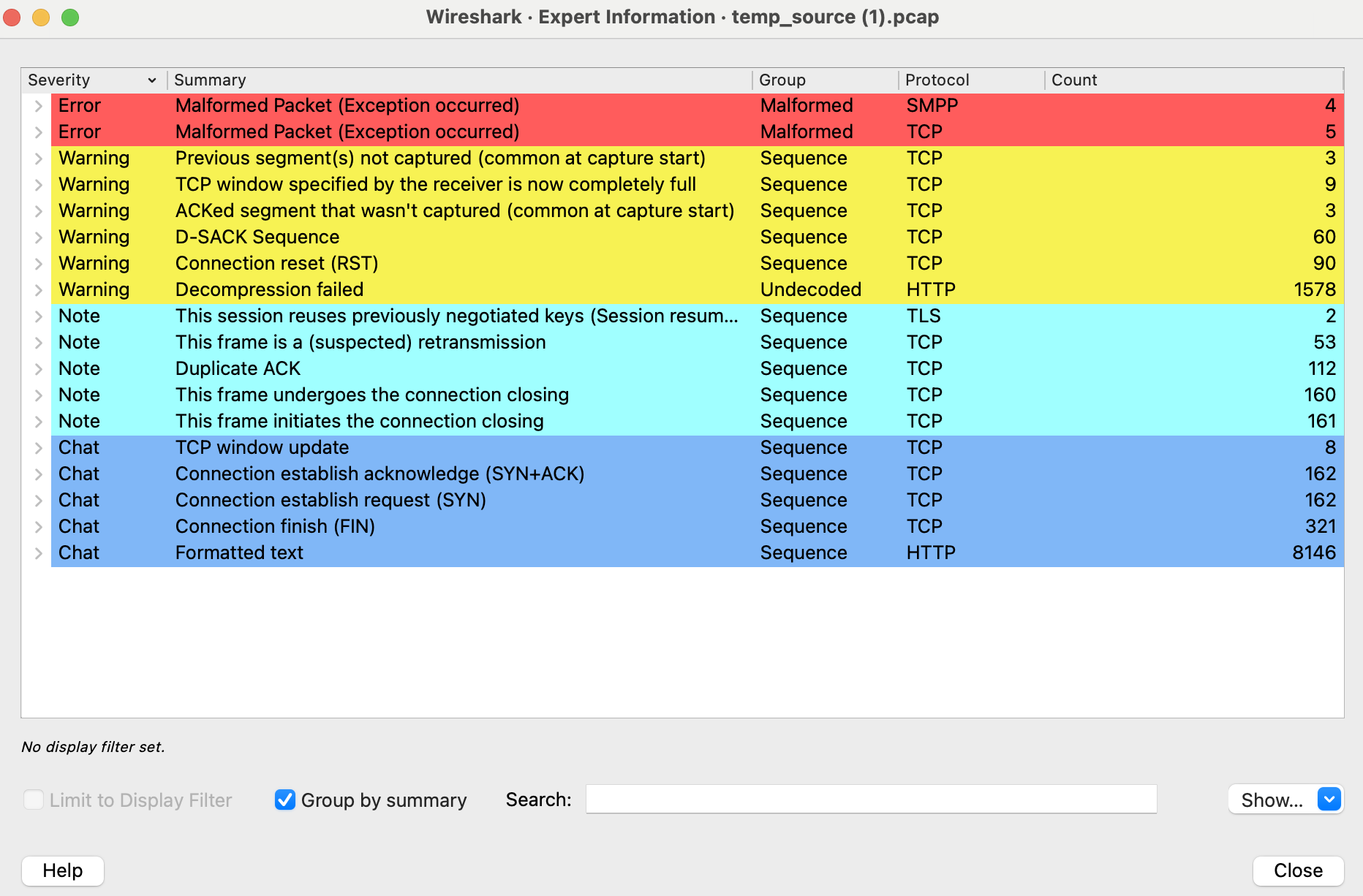 点击它,就可以进入专家信息界面,快速获取到整个抓包文件里的网络状况。比如是否有重传、握手异常、挥手异常等,都一目了然。