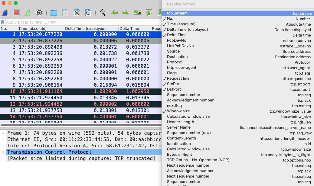 说到这里,我们也要提一下给报文列表区域编辑自定义字段的重要性了。在使用Wireshark的经验越来越丰富后,我们一定要做一件事情,就是持续迭代这些字段。为什么呢?