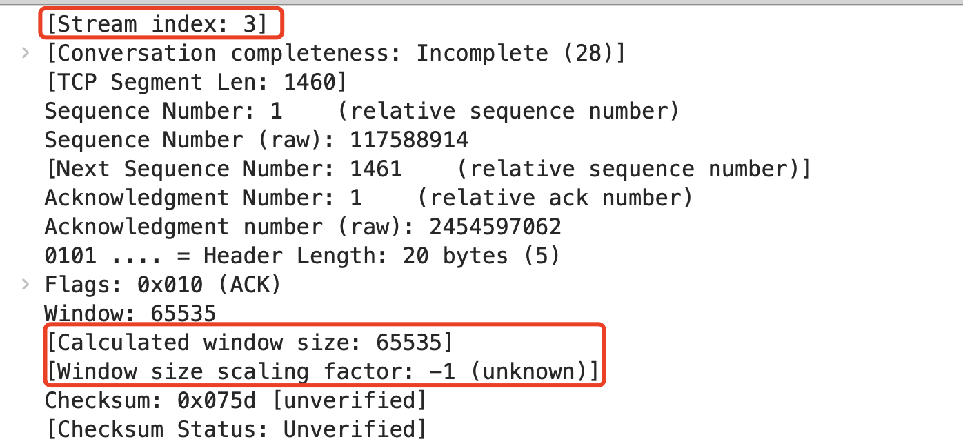 - 随后是两个关于窗口的信息,说明Wireshark尝试用窗口扩大因子去计算出实际生效的窗口值。由于协议设计的关系,TCP窗口扩大因子只存在于握手报文里,而这个抓包文件里不含握手报文,因而不知道扩大因子的值(红框中的unknown的原因),也就导致Wireshark无从计算出正确的实际窗口值。这种情况下,Wireshark给出的实际窗口值跟未扩大的原始窗口值一致(在这里都是65535)。