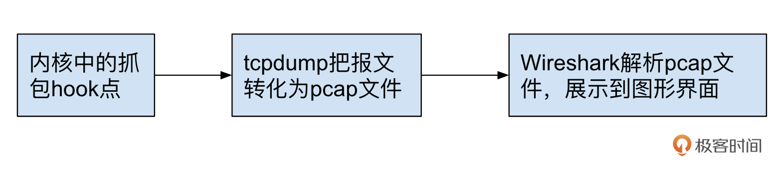 从抓包文件的生产者比如tcpdump程序的角度来看,“一个TCP报文”就是在内核网络的抓包hook点获取到的网络数据。我们可以用下图来概括地表示整个过程: