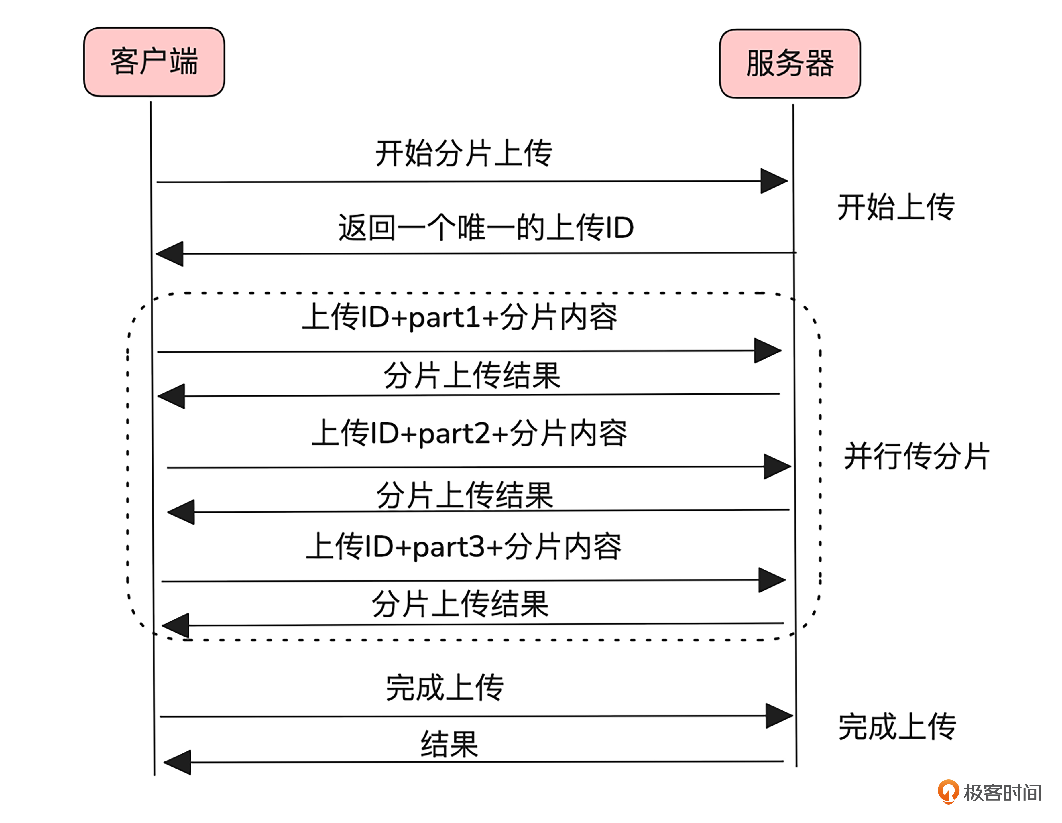 想要解决这个问题,我们需要先了解分片上传的过程,分片上传通常分为开始上传、并行上传分片和完成上传三个步骤。我画了一张简图,便于你理解这三步的交互。
