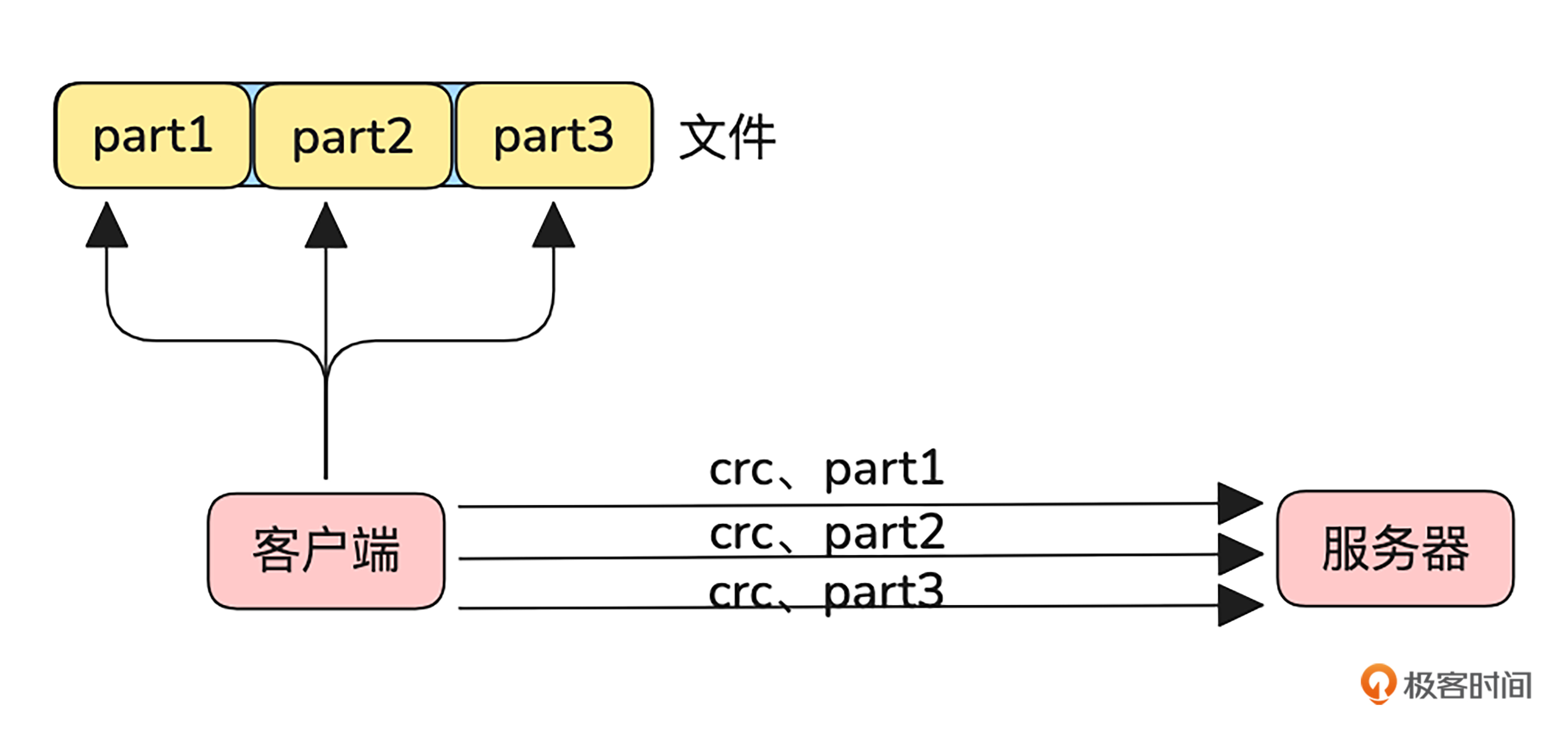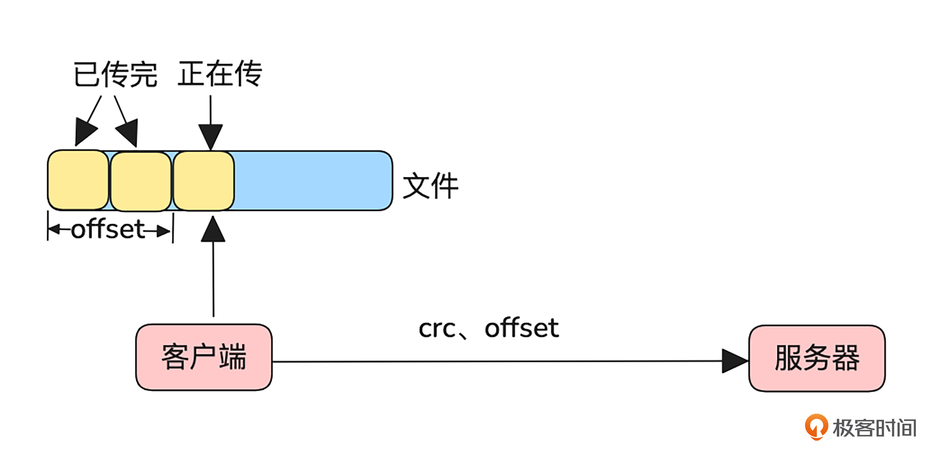 为了防止脏数据,还可以在http header中带上文件的crc校验值,服务器收完文件校验一下这个值,再结合前面讲的对比一下文件前后若干字节的内容就可以了。