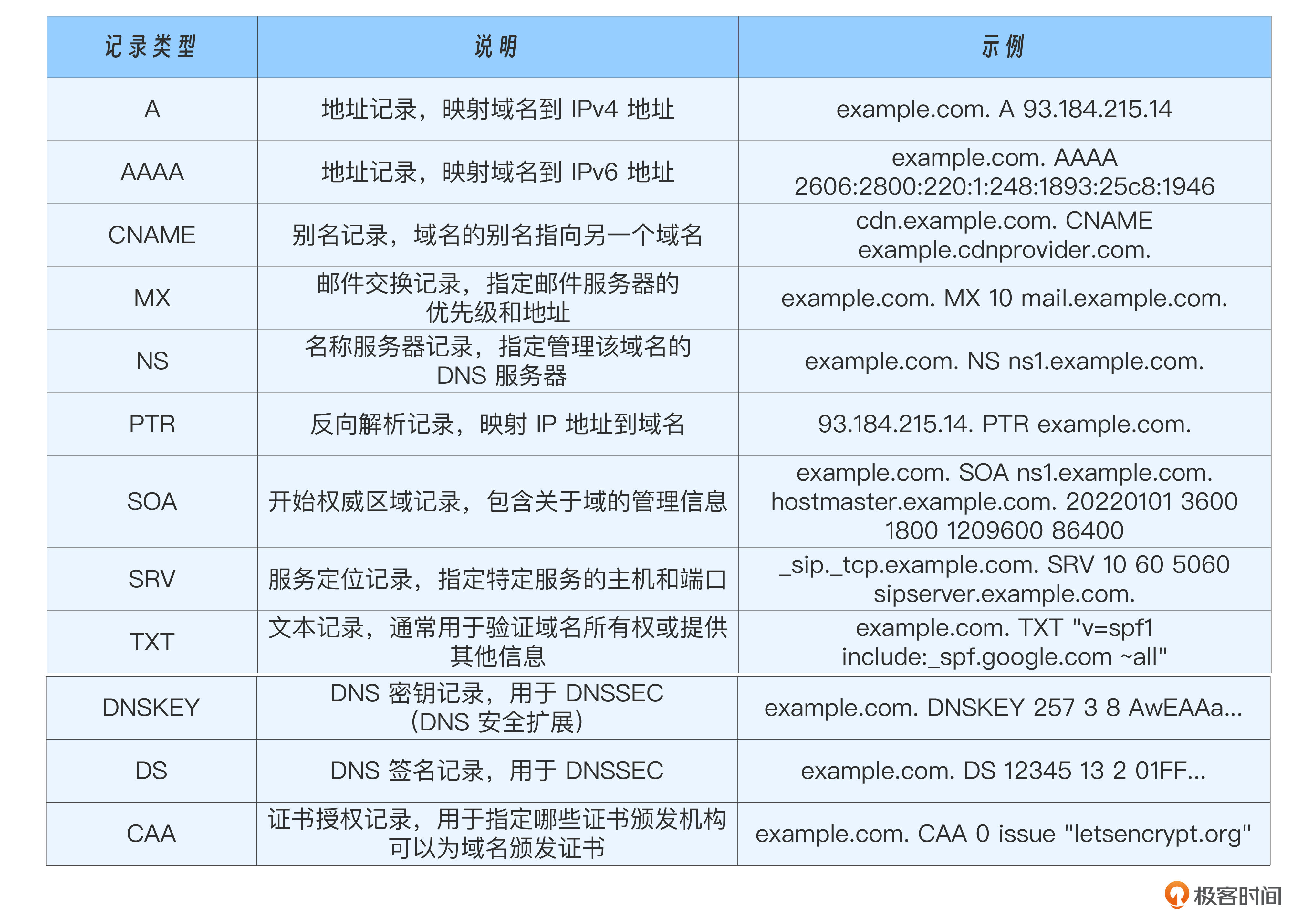 然后,我们了解了 DNS 的缓存机制,以及自己的机器是怎样找到本地 DNS 服务器的。之后,我们学习了 DNS 的记录类型,比如我们常用的域名到 IPv4 地址的A记录,一个域名到另一个域名到CNAME记录等。