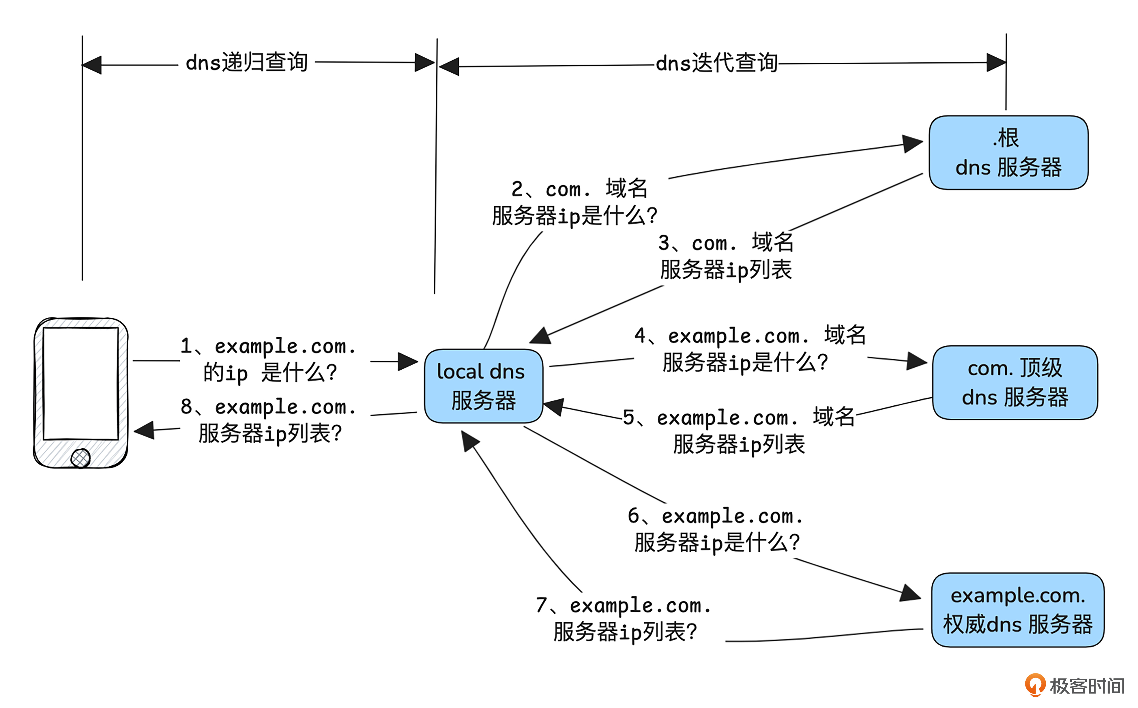 这张图详细梳理了客户端 DNS 查询 example.com 的 IP 过程,详细步骤是这样的。