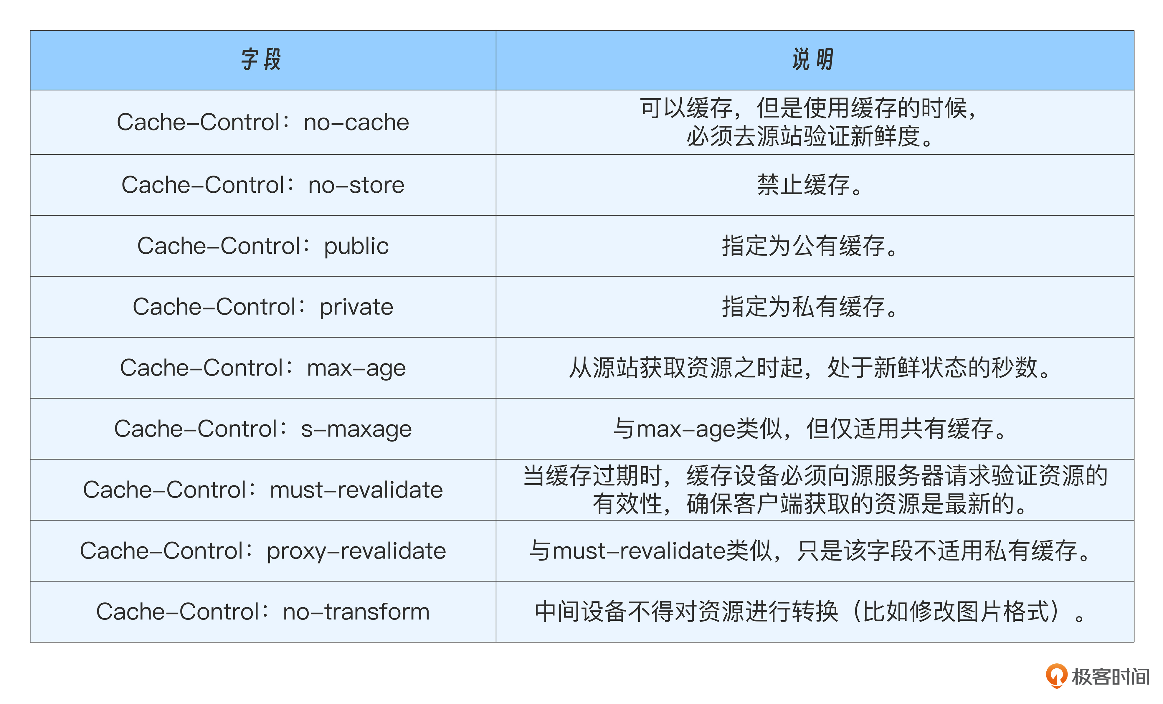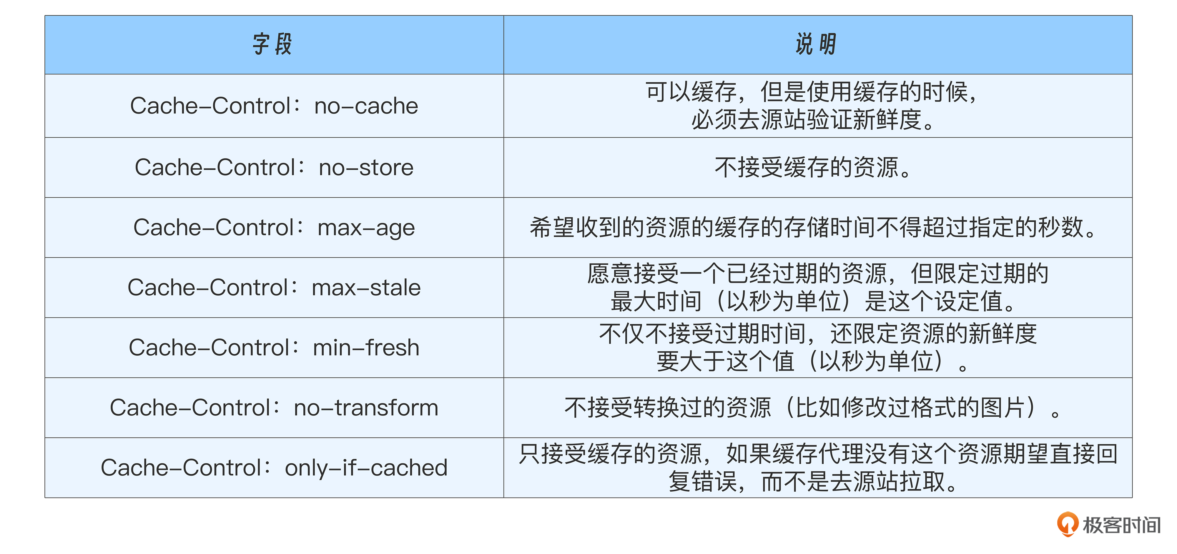 资源的新鲜度相当于食物的保质期,那请求的缓存控制就相当于不同人对不同食物保质期的容忍度。我将客户端缓存控制常用字段列成表格,供你参考。