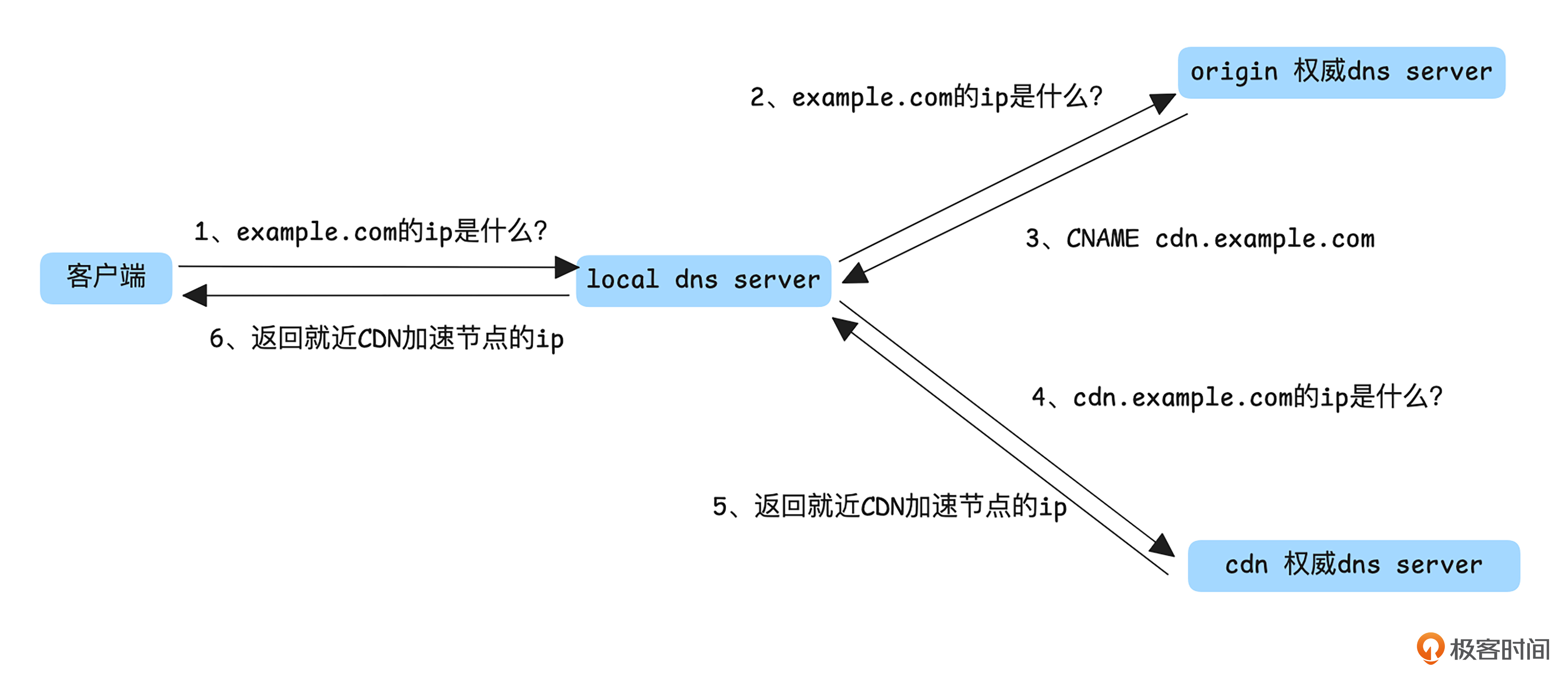 假设我是example.com的维护者,现在我想对其进行CDN加速,那么我需要先找某个CDN厂商给我分配一个加速域名,假设是cdn.example.com。然后,我会将原始域名example.com的dns解析结果配置成CNAME类型的记录,值为cdn.example.com。这样客户端进行cdn.example.com域名解析的时候就会按照上图的步骤解析出 CDN 加速节点的 IP。