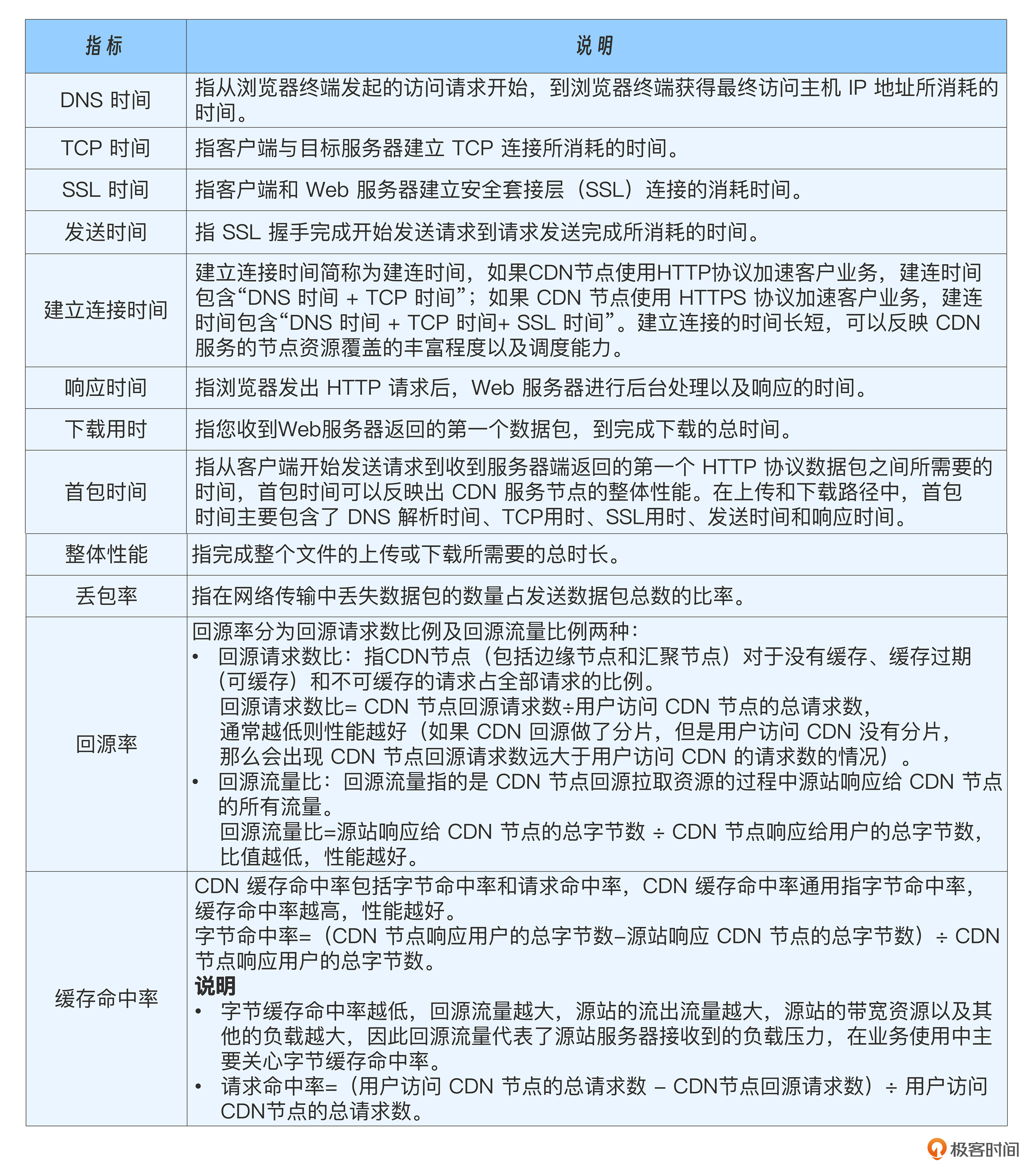 现在,我们已经从整体上学习了CDN架构,那么这个架构的性能如何度量呢?我们可以参考一下阿里云CDN的性能指标。