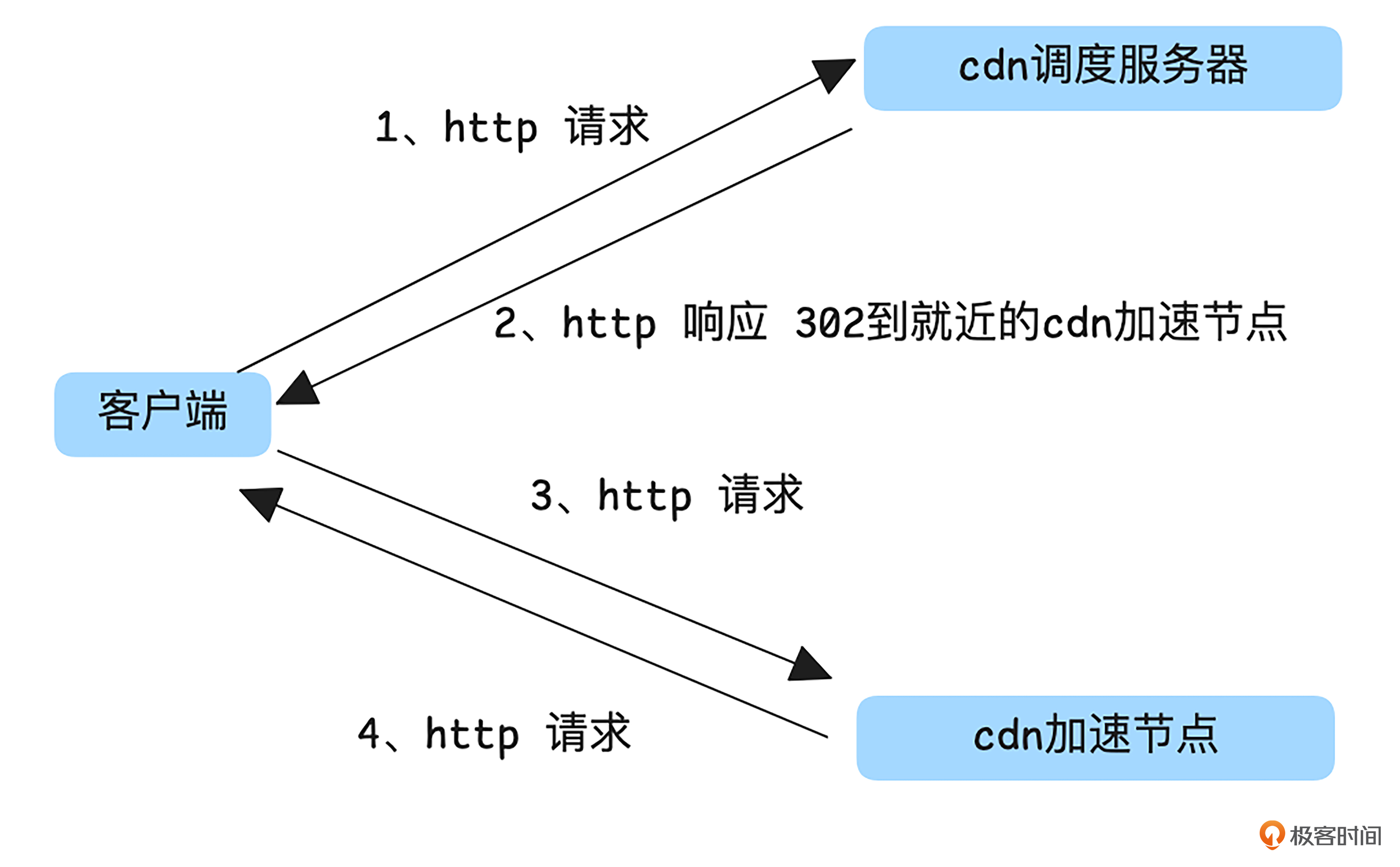 CDN还可以通过 HTTP 302 重定向进行调度。我们这就来看看它的具体过程。首先,将原始域名的解析结果指向 CDN 的调度服务器。客户端请求到达 CDN 调度服务器后,调度服务器会根据请求信息,特别是客户端的公网IP,决定是否将请求重定向到最近的 CDN 加速节点。我画了个示意图,帮助你更直观地理解这种调度方式。