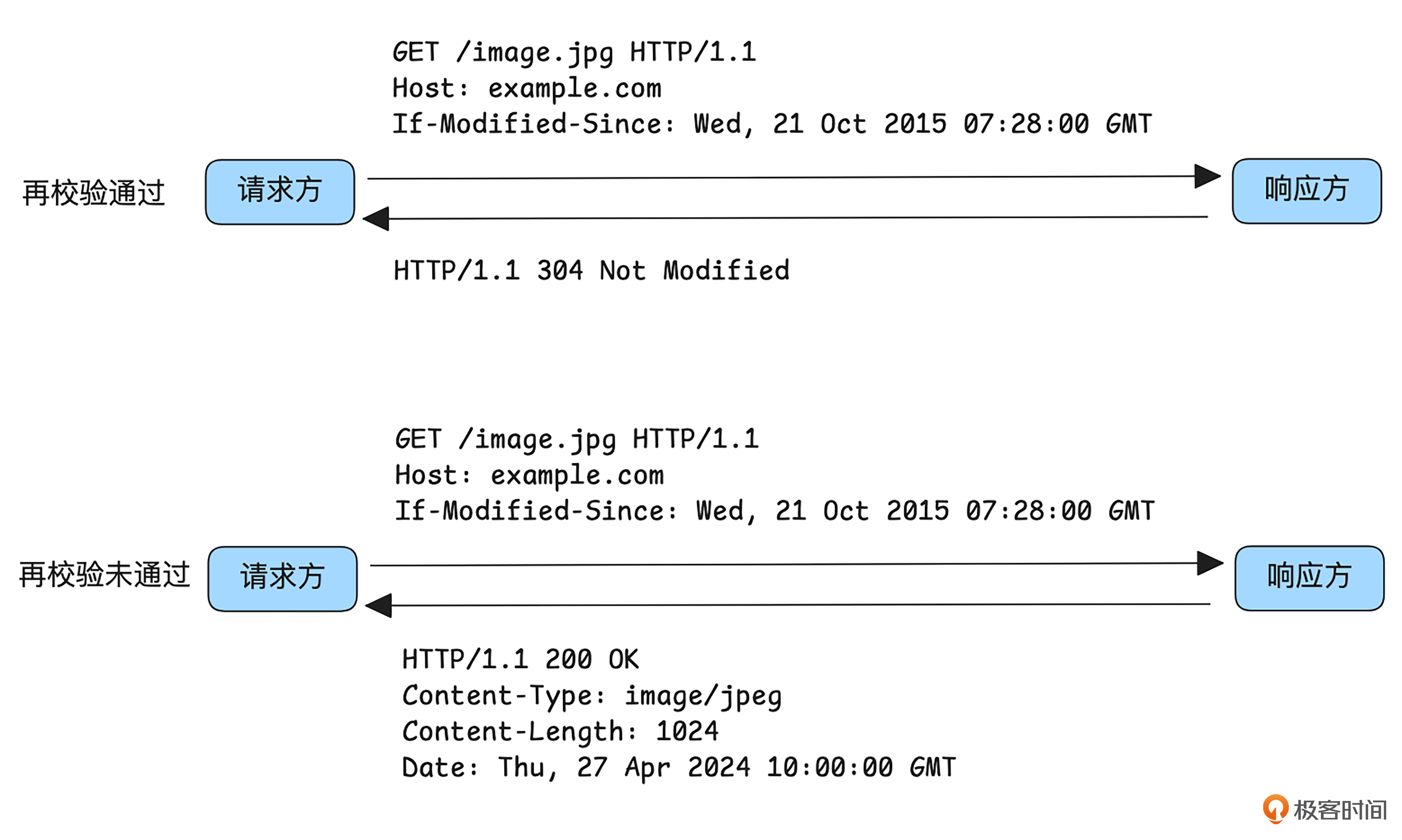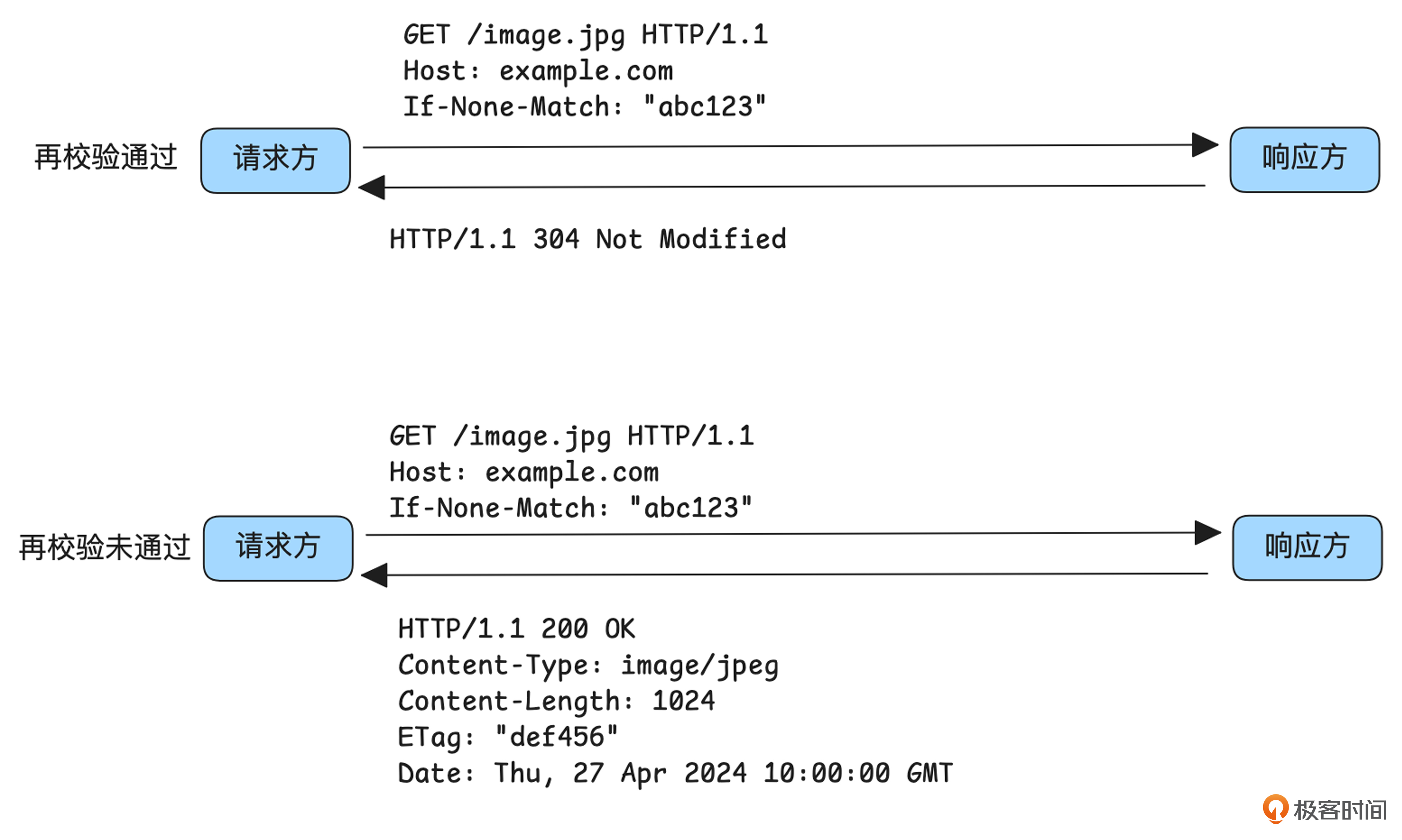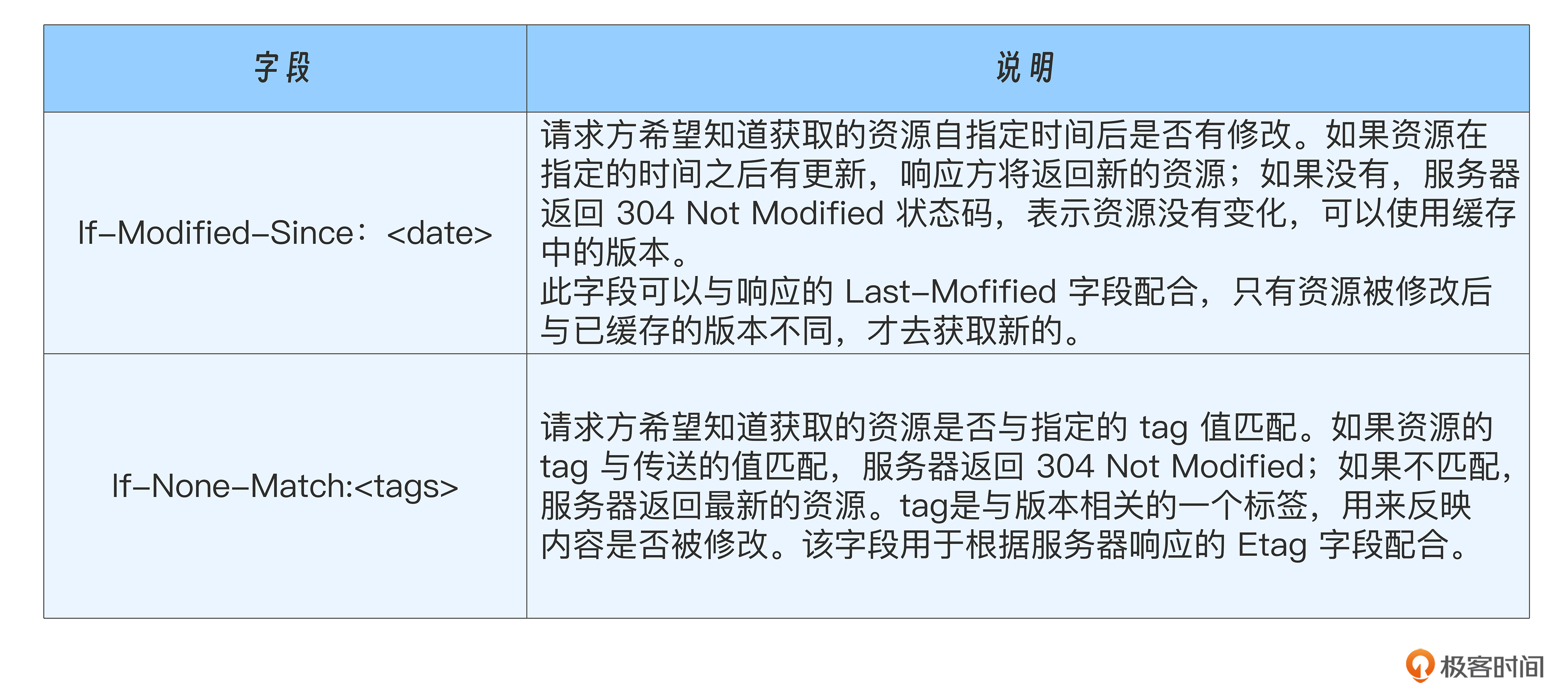 有时候请求方不止期望通过时间维度来判断是否使用缓存,还期望向对方发起再验证,用来校验自己能否继续使用本地的缓存,获取最新的资源。我将最常用的两个再验证字段列成表格,供你学习。