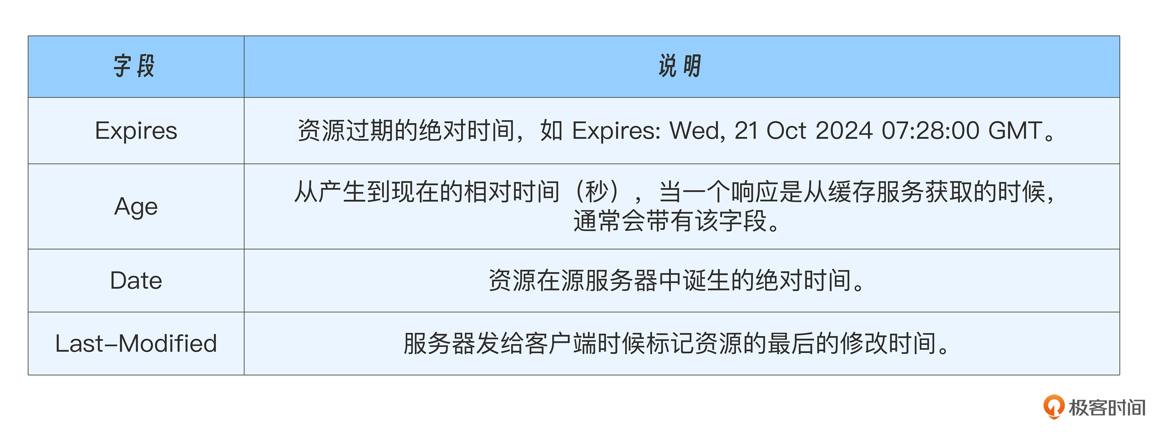 上面表格中Cache-Control:max-age、Cache-Control:s-maxage可以用来计算资源新鲜度。除此之外,还有几个常用的参与资源新鲜度的字段,我列到下面的表格,供你参考。
