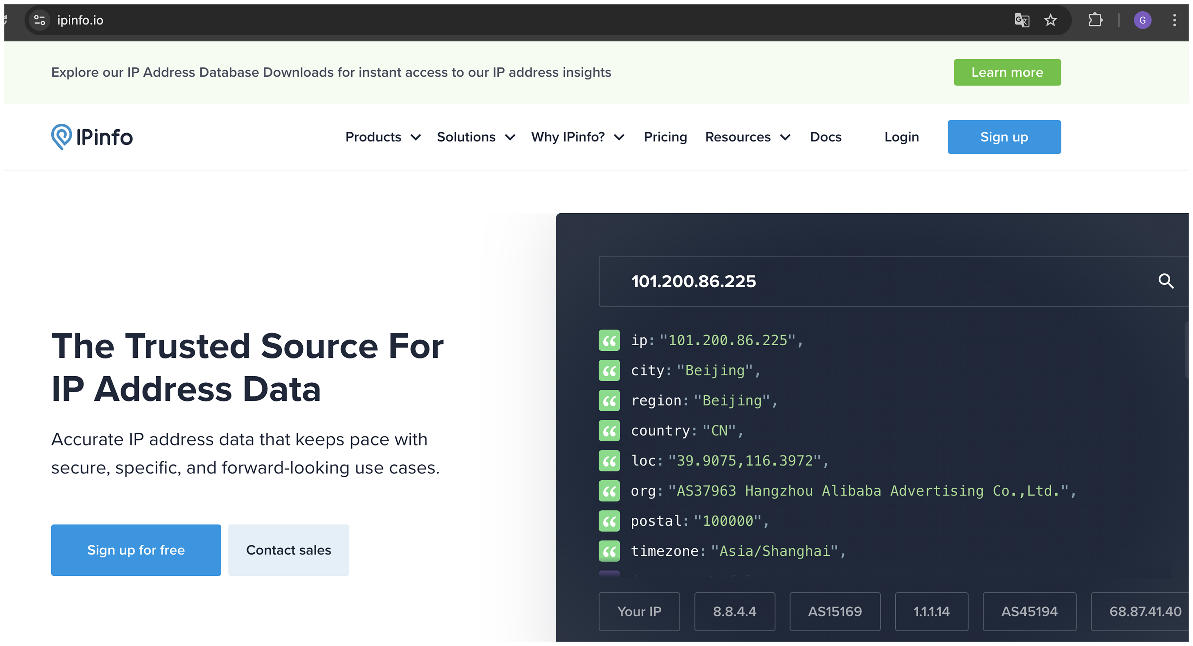 比如我输入了一个极客时间的公网ip 101.200.86.225,可以看到,这个IP位于北京。