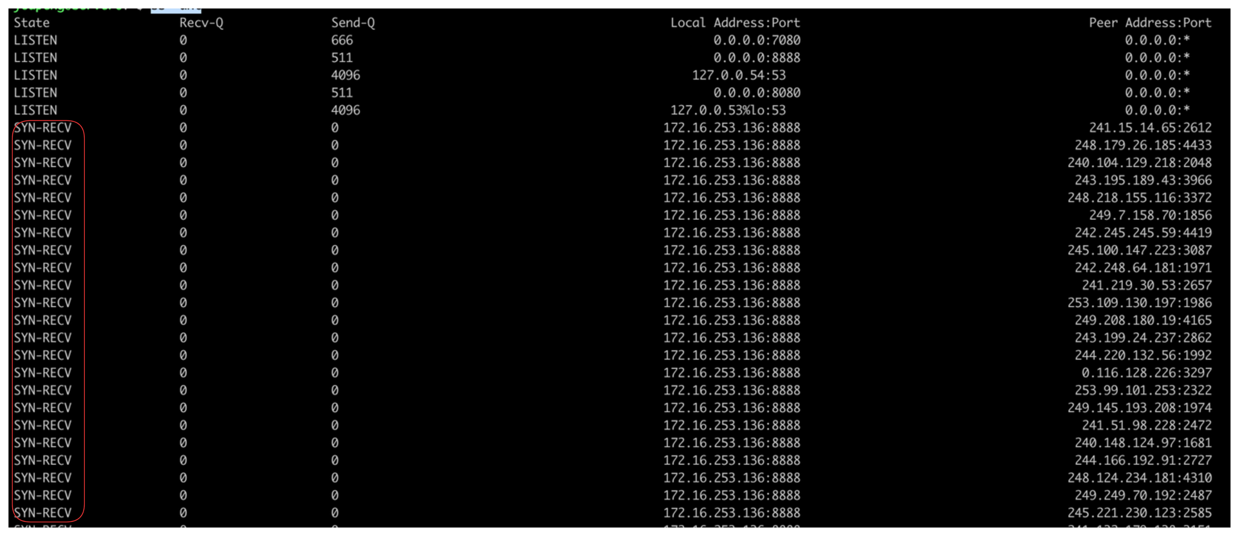 如上图所示,可以发现有很多不同的IP和该机器的8080端口尝试建立tcp连接,并且这些连接都处于SYN-RECV状态。