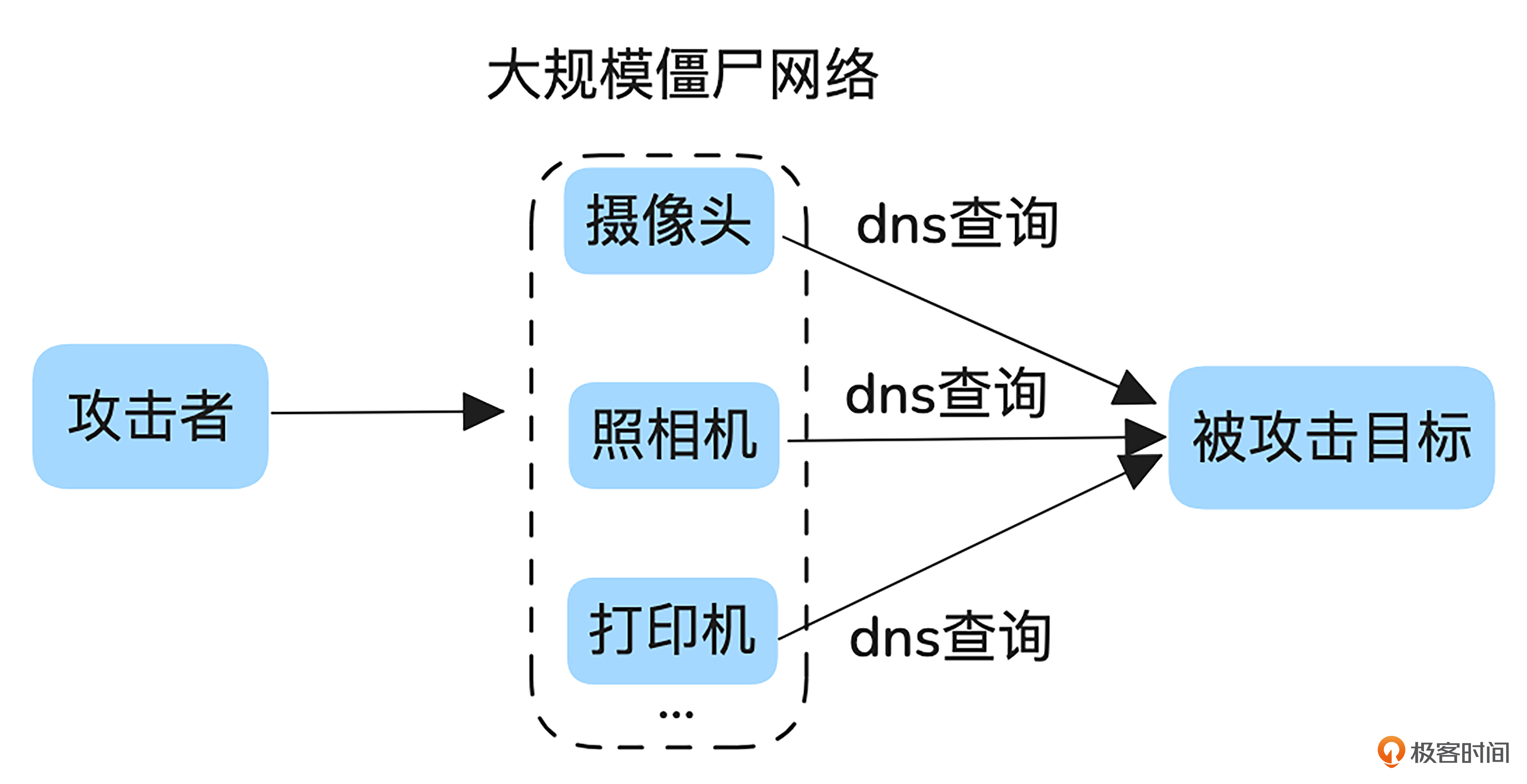 我们来看另一个DDoS攻击的经典案例。2016年,Dyn公司遭遇了一次大规模的DDoS攻击,攻击源头是大量物联网设备(如智能摄像头、照相机等)被黑客通过恶意软件控制后,成为了“僵尸网络”发动攻击。