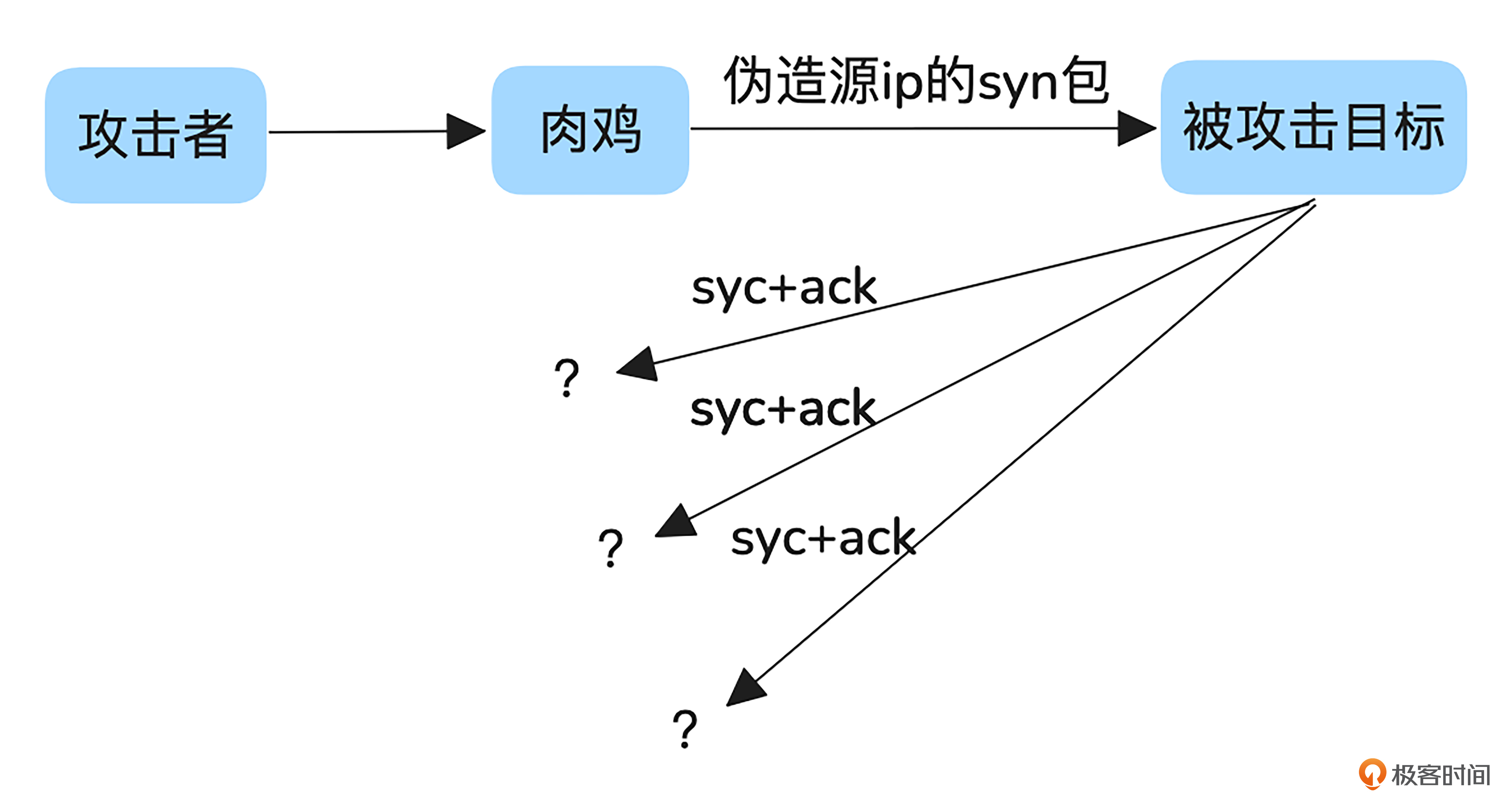 如上图所示,攻击者通过一批被控制的肉鸡(僵尸网络),向目标服务器发送大量伪造源IP地址的TCP SYN报文。当服务器收到这些SYN报文时,会在半连接队列中记录这些连接信息,并尝试通过发送SYN-ACK报文来完成握手。