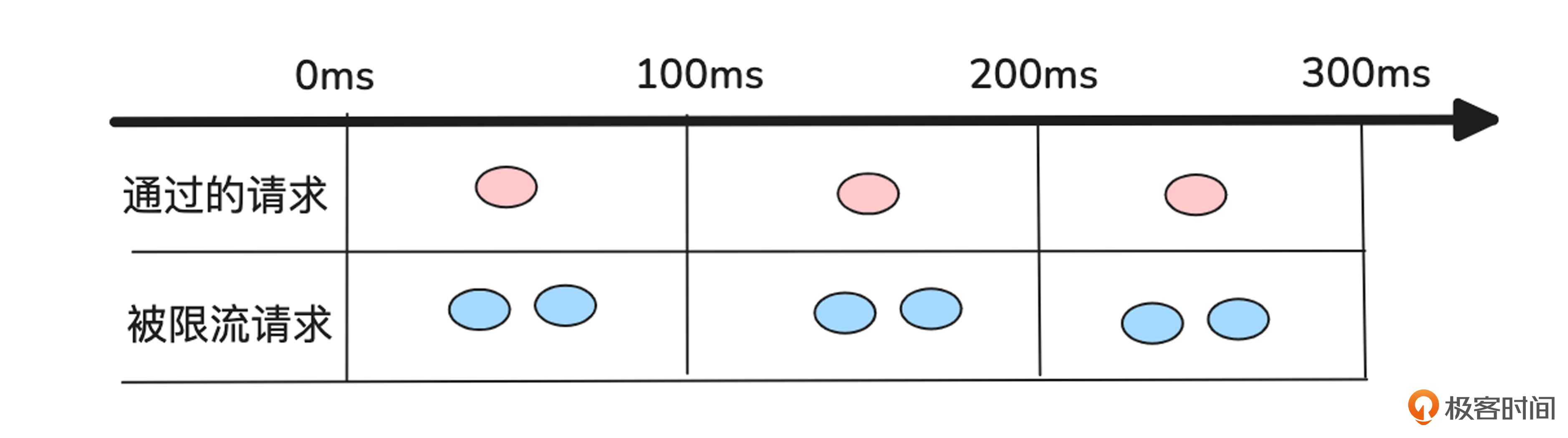 首先,要注意的是 Nginx是基于毫秒维度进行限制的。怎么理解这个意思呢?假如你配置的是rate=10r/s,字面上意思是1秒可以通过10个请求,但Nginx实现的时候会换算成毫秒,也就是每100ms通过一个请求。我画了一个示意图来帮你理解这个过程。
