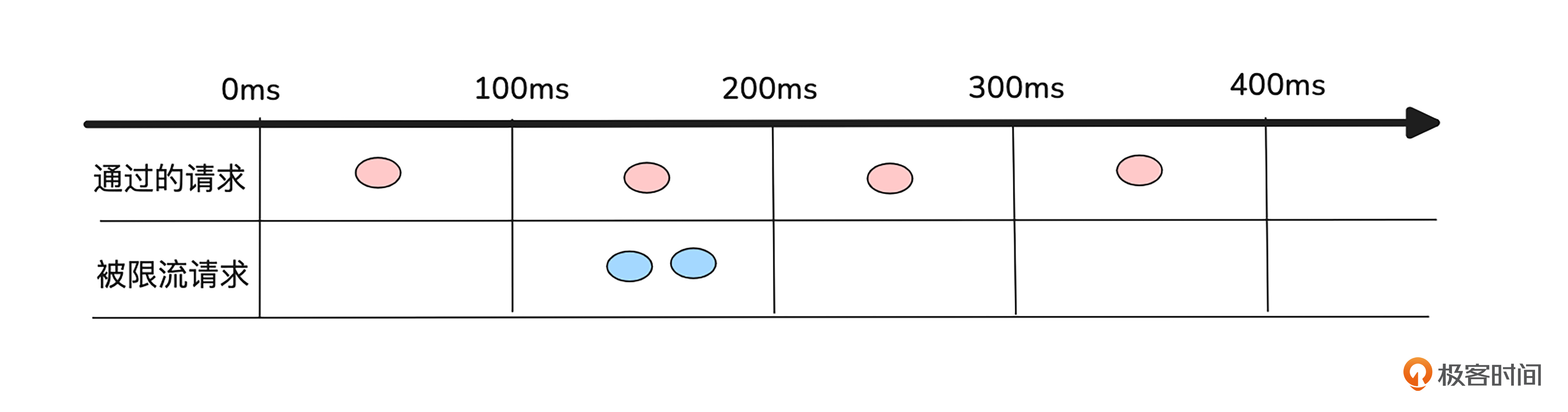 如上图所示,假设在第0到100ms之间有一个请求,第100到200ms之间有三个请求,虽然在这1s内还没达到10个请求,但是由于100到200ms之间的请求数量大于1,所以也会有两个请求被限制。