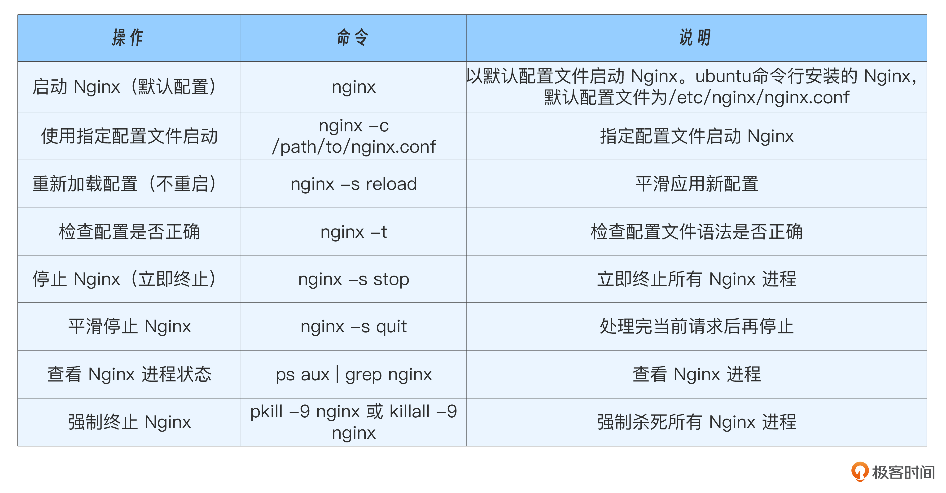 我将 Nginx 的基本操作整理成一个表格,方便刚刚接触Nginx的同学查阅。