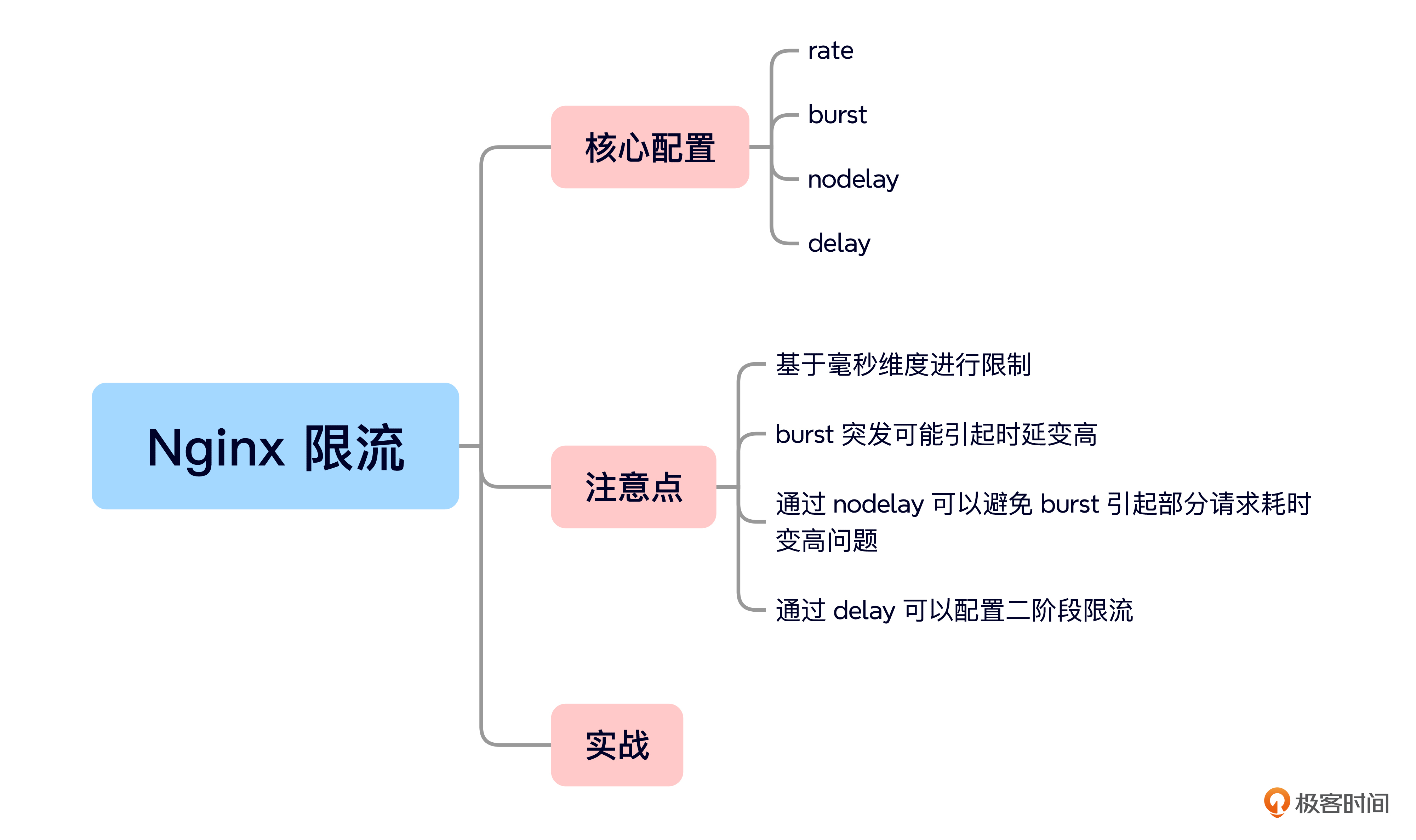 Nginx 官方博客 rate-limiting-nginx 详细讲解了限流的原理及相关细节,能够帮助我们澄清许多常见误区,建议你优先参考这篇第一手资料。如果你希望进一步加深理解,我们今天将结合实验进行分析和探讨。