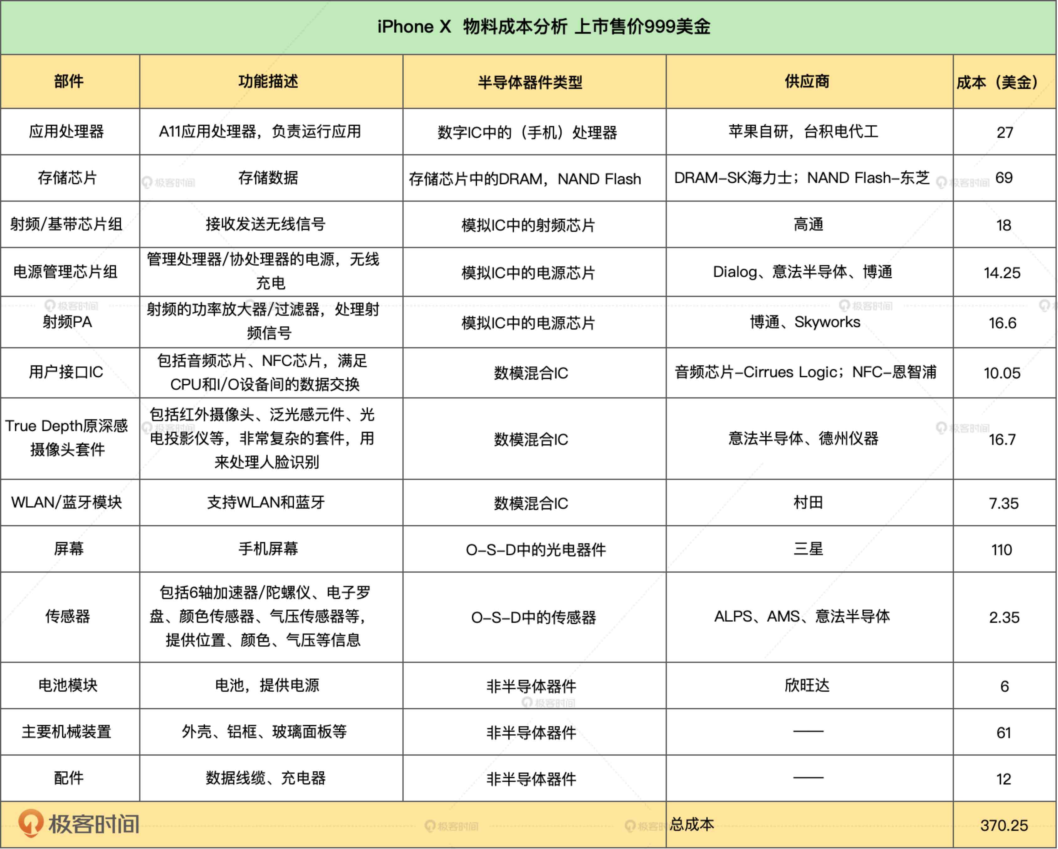 现在,有了一张半导体产品分类图,一张充满半导体元器件的物料表,下面我们就顺着这两个线索,逐一地讲解一部iPhone X所用到的半导体产品。