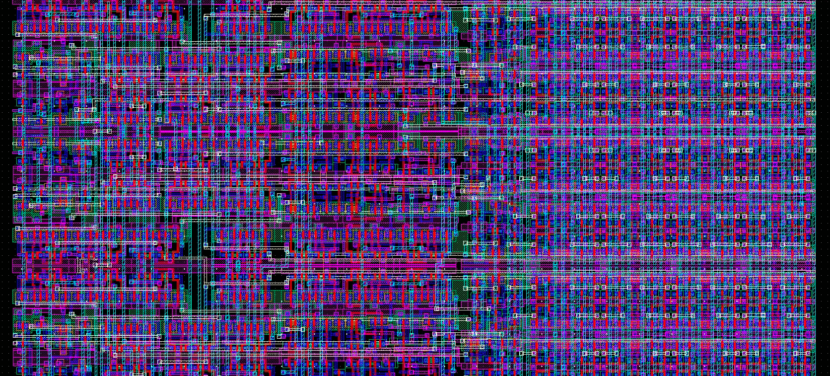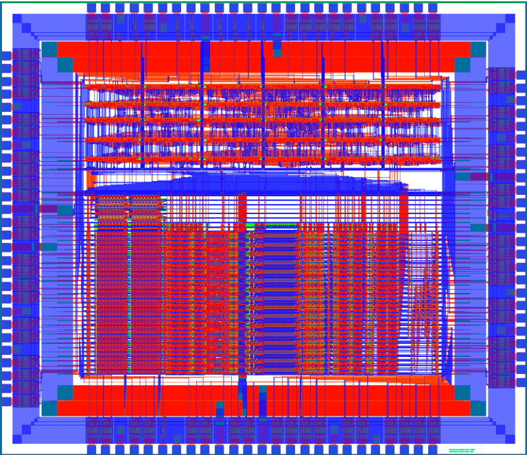 物理设计完成之后就形成了下图展示的电路图。图中可以看到蓝、红等不同颜色,每种颜色就代表着一张光罩。这个时候的芯片设计就可以以GDSII的文件格式从设计公司移交给芯片代工厂了。自此,设计完成,制造流程开始。