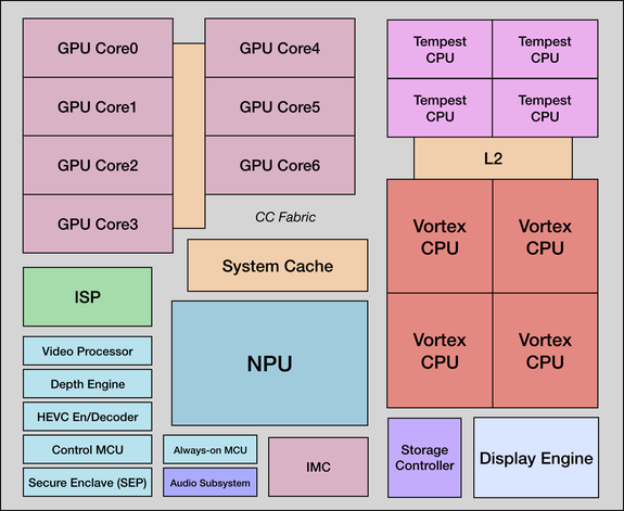 在拿到需求分析文档后,高层设计人员,往往是以架构师为主的团队,需要开会对产品需求逐条进行可行性分析,并在此基础上确定基本架构和模块分解,最终设计出一个系统架构。我可以给你看看,苹果A12的一张系统架构图,你可以感受一下。
