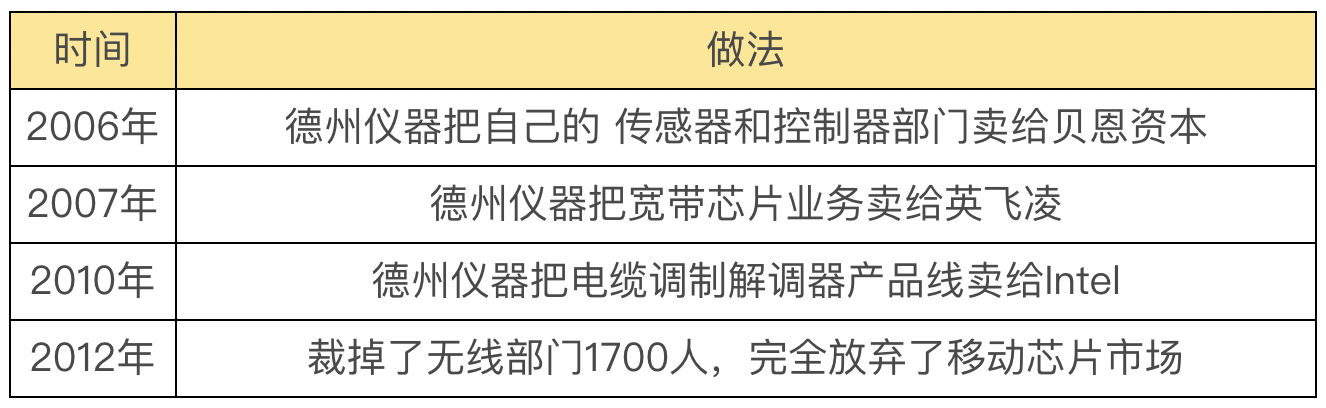 所谓转型,放弃之前的强势产品线,这个其实非常见管理功力。多元化的布局,也并不是什么都做。放弃,才能把资源聚集在最有竞争力的产品和市场上。我大概梳理了个表格,你可以看看从二十世纪初开始,德州仪器是如何消减数字芯片业务的。