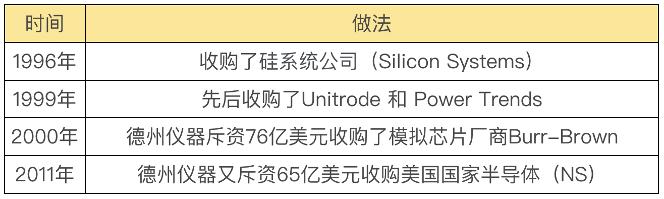 这里要说一下,美国的公司,一直非常重视通过收购和并购来增强公司的竞争力。麦肯锡曾经给出半导体产业的一个建议就是每个公司应该每年用自己市值的3%-5%,来收购相邻技术的公司,扩张自己的领域。而德州仪器在收购公司方面一直比较活跃,我也列了一个德州仪器收购公司的时间表。