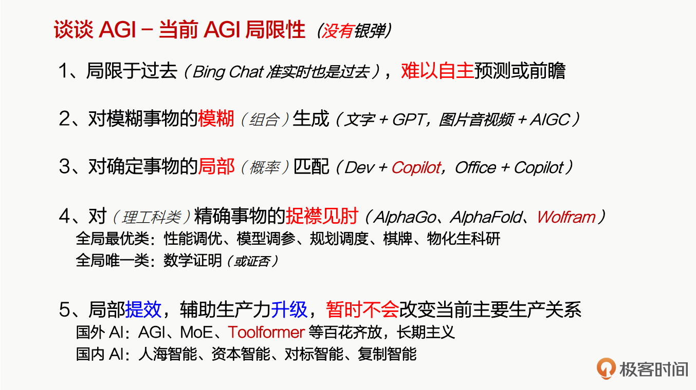 目前的AGI,也就是大家看到的GPT-4。后面图里列出来的这五个方面它是搞不定的。