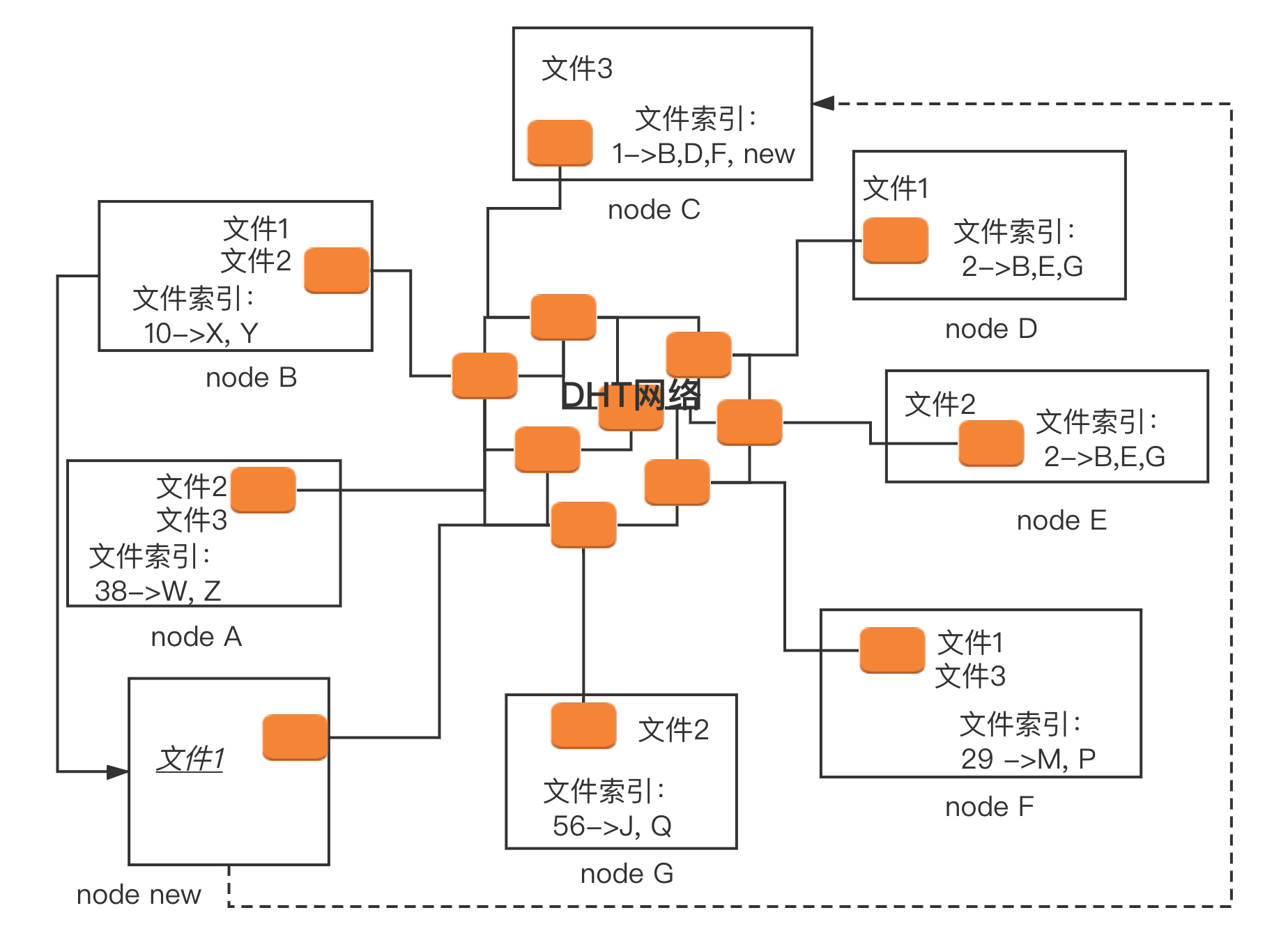 但是你会发现node new上没有文件索引,但是根据哈希算法,一定会有某些文件的哈希值是和node new的ID匹配上的。在DHT网络中,会有节点告诉它,你既然加入了咱们这个网络,你也有责任知道某些文件的下载地址。