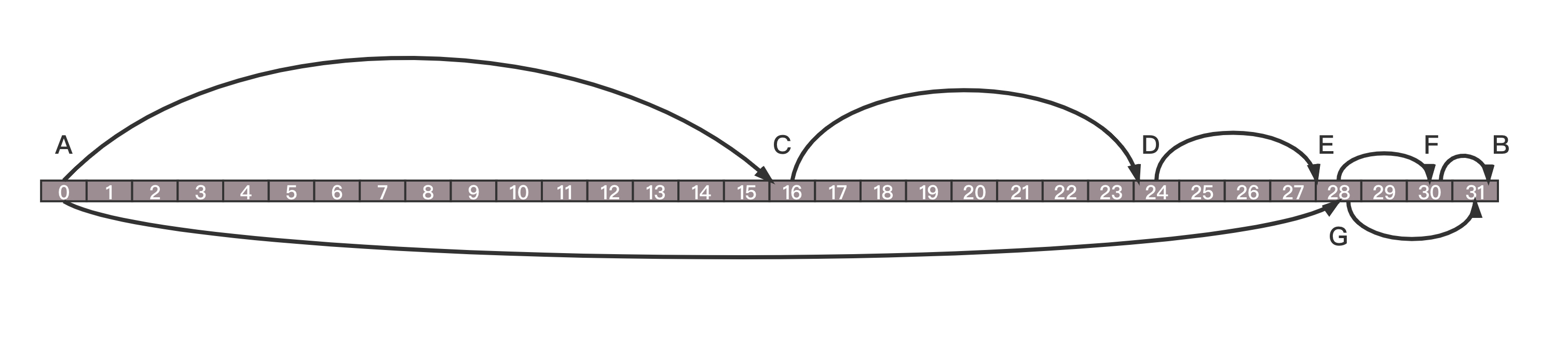 A和B每一位都不一样,所以相差31,A找到的朋友C,不巧正好在中间。和A的距离是16,和B距离为15,于是C去自己朋友圈找的时候,不巧找到D,正好又在中间,距离C为8,距离B为7。于是D去自己朋友圈找的时候,不巧找到E,正好又在中间,距离D为4,距离B为3,E在朋友圈找到F,距离E为2,距离B为1,最终在F的朋友圈距离1的地方找到B。当然这是最最不巧的情况,每次找到的朋友都不远不近,正好在中间。