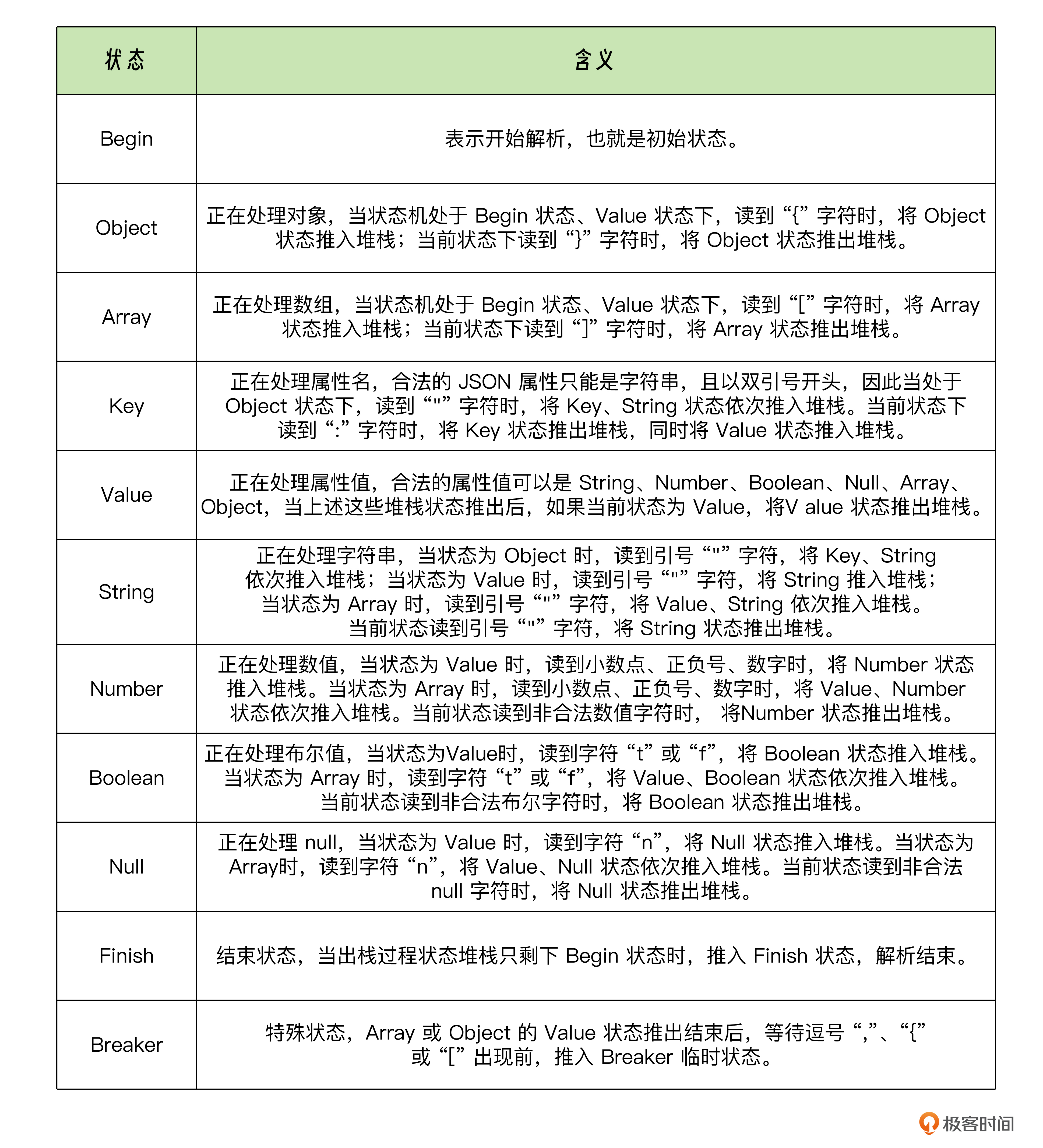 首先是状态机。我们为什么要给JSON定义这么多状态,而不是直接正则匹配一大串字符?因为 JSON 结构具有嵌套、递归特性,用状态机+栈可以清晰地表示进入和退出不同层级。