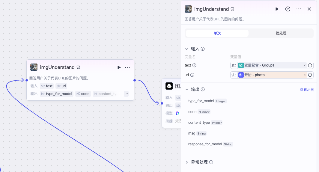 接下来,我们将变量聚合结果和用户上传照片作为输入传给图像识别节点,这是扣子官方的imgUnderstand插件: