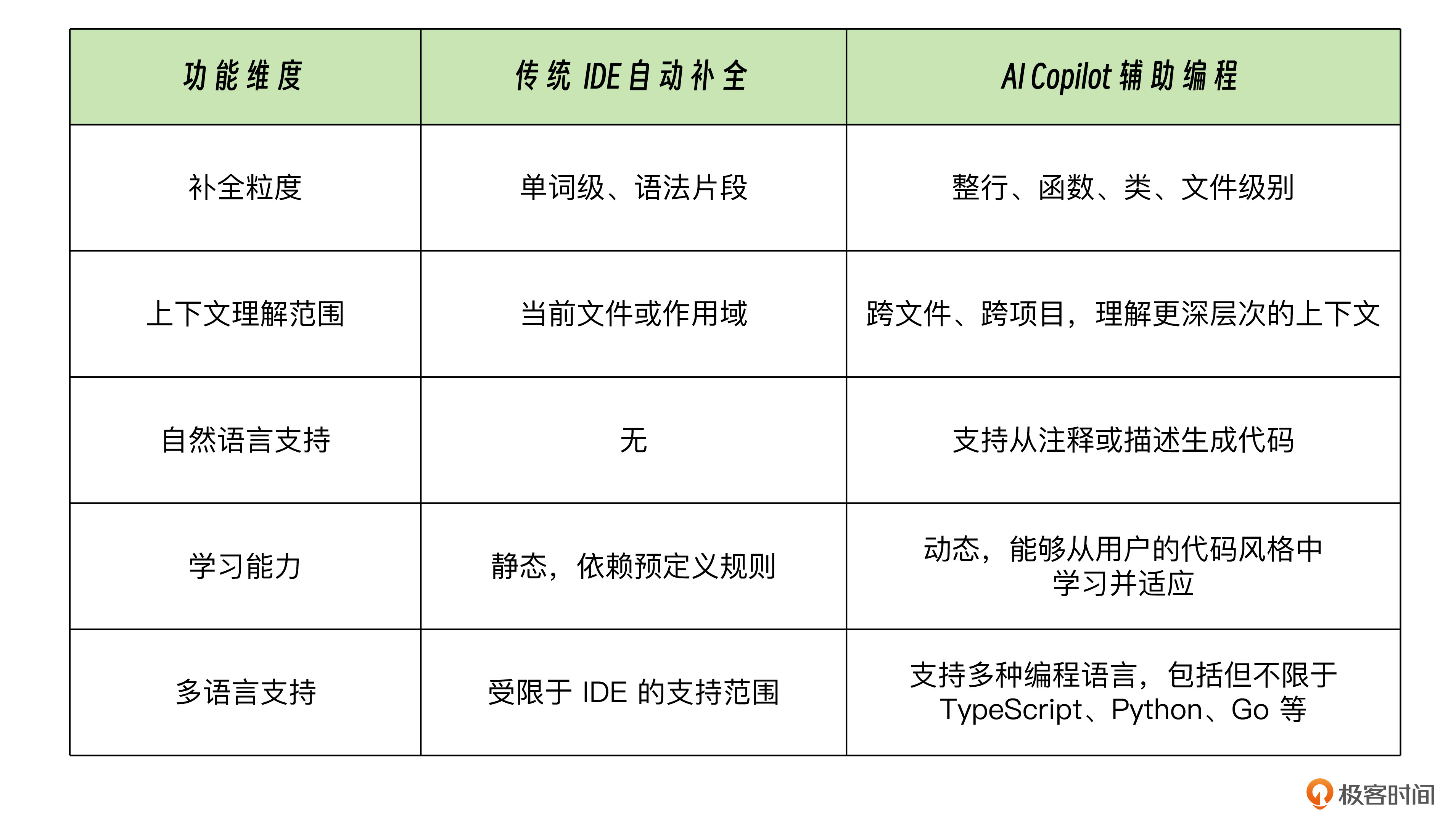 为了方便你直观对比传统IDE跟AI Copilot辅助编程方式的区别,我列了一张表格。
