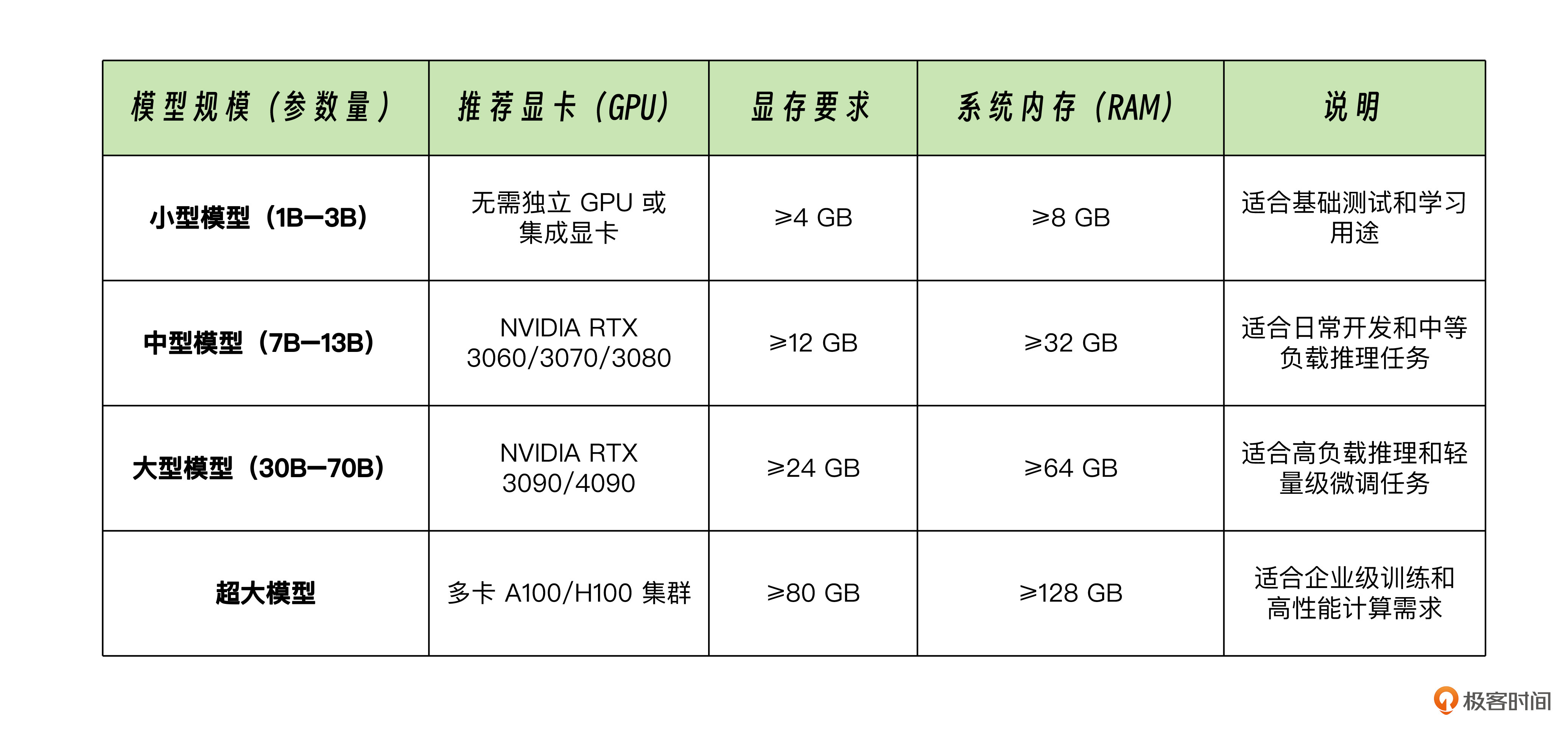 以下是推荐的模型规模与硬件配置,如果大家有需求的,在配置相应的电脑硬件时可以参考。