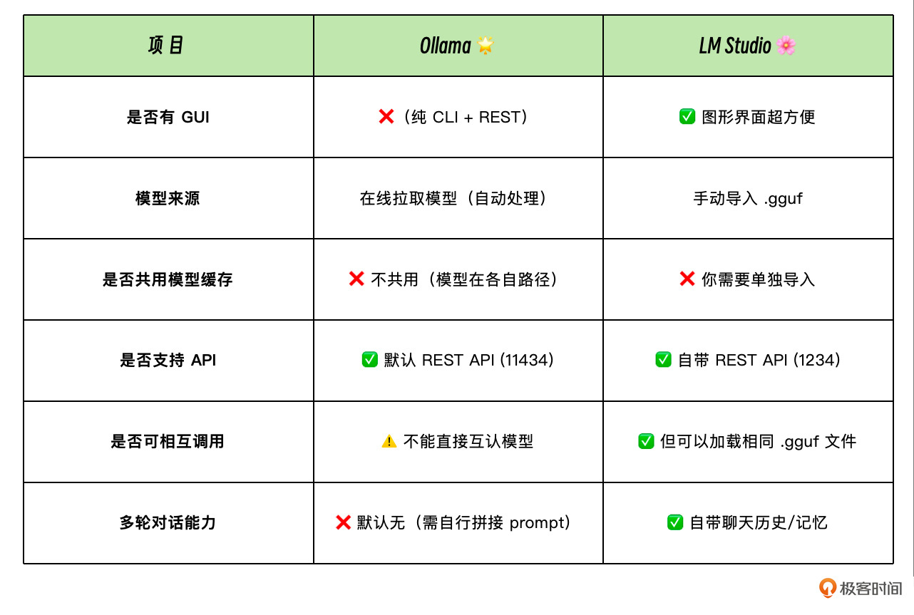以下是 Ollama 与 LM Studio 的核心区别,有兴趣的同学可以课后自行去 LM Studio 官网(https://lmstudio.ai/)下载和体验它。