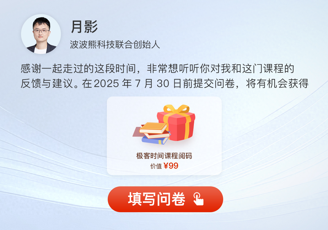 最后,我准备了一份结课问卷,花几分钟就能填完。很期待能听到你的反馈,说说你对这门课程的想法和建议。