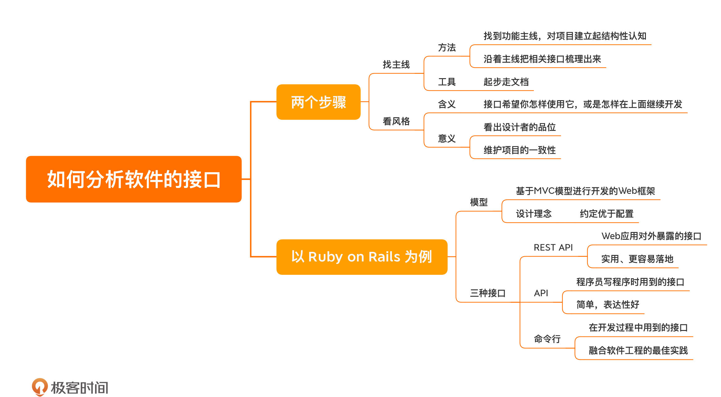今天,我们学习如何了解设计的第二部分:看接口。看接口的一个方法是找主线,看风格。先找到一条功能主线,对项目建立起结构性的了解。有了主线之后,再沿着主线把相关接口梳理出来。