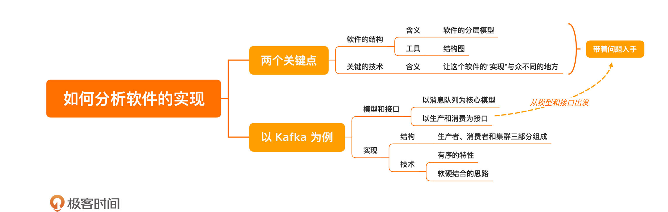 可能你还不太理解我的意思,下面我就以开源软件Kafka为例,给你讲一下如何把地图展开,去看一个软件的实现。按照我们之前讲过的思路,了解一个软件设计的步骤是“先模型,再接口,最后看实现”。所以,我们要先了解Kafka的模型和接口。
