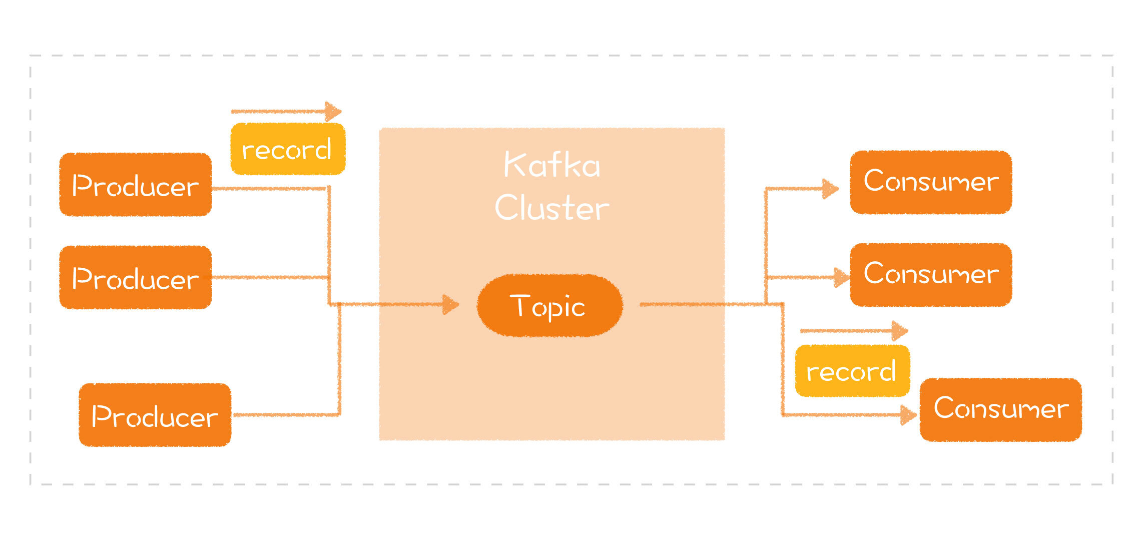 如果在网上搜索Kafka的架构图,你会搜到各种各样的图,上面包含了不同的信息。有的告诉你分区(Partition)的概念,有的告诉你Zookeeper。根据前面对模型的介绍,我特意挑了一张看上去最简单的架构图,因为它最贴近消息队列的基础模型: