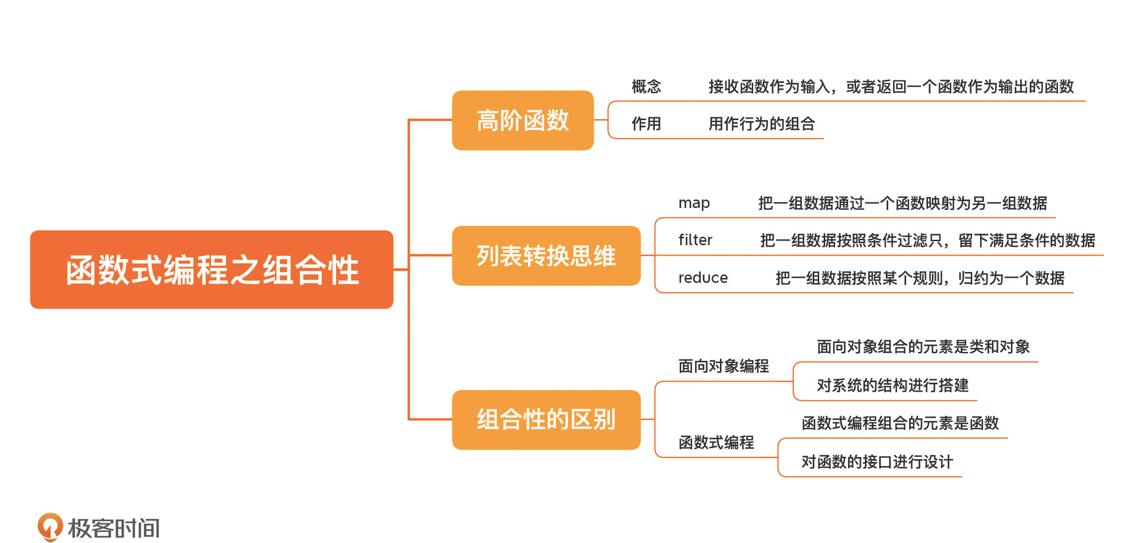 至此,我们已经学习了函数式编程的组合。你可能会有一个疑问,我们之前在讲面向对象的时候,也谈到了组合,这里讲函数式编程,又谈到了组合。这两种组合之间是什么关系呢?其实,对比一下代码,你就不难发现了,面向对象组合的元素是类和对象,而函数式编程组合的是函数。