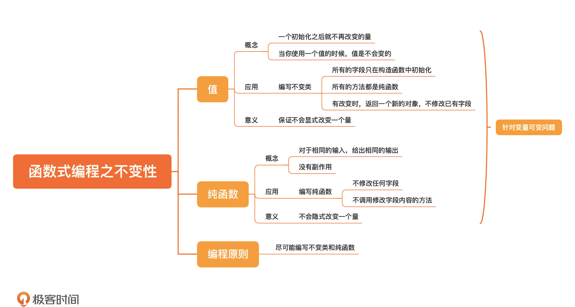 函数式编程的不变性主要体现在值和纯函数上。值,你可以将它理解为一个初始化之后就不再改变的量,换句话说,当你使用一个值的时候,值是不会变的。纯函数,是符合下面两点的函数: