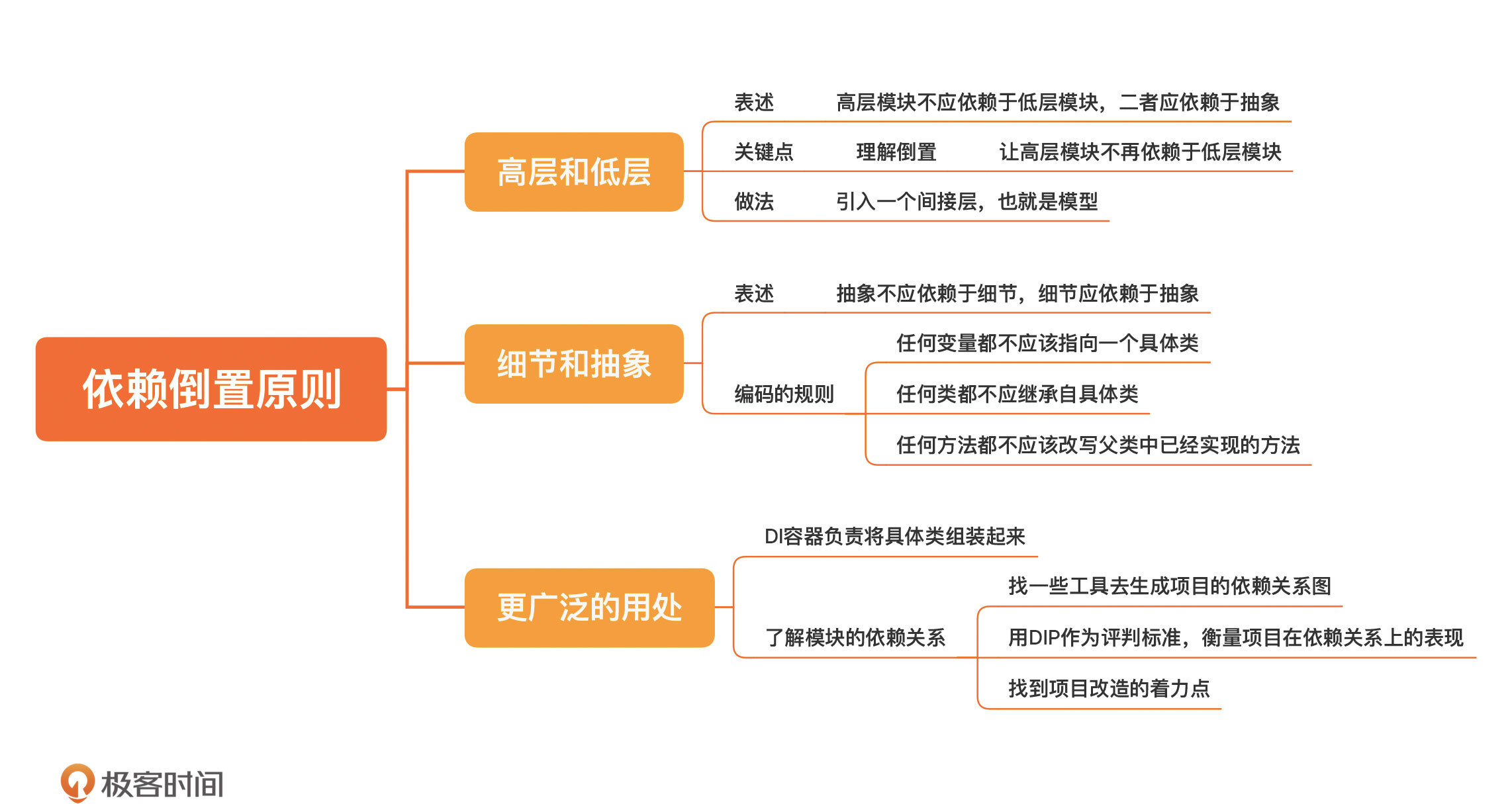 2、“理解了 DIP,再来使用 DI 容器,你会觉得一切顺理成章,因为依赖之所以可以注入,是因为我们的设计遵循了 DIP。而只知道 DI 容器不了解 DIP,时常会出现让你觉得很为难的模型组装,根本的原因就是设计没有做好。”